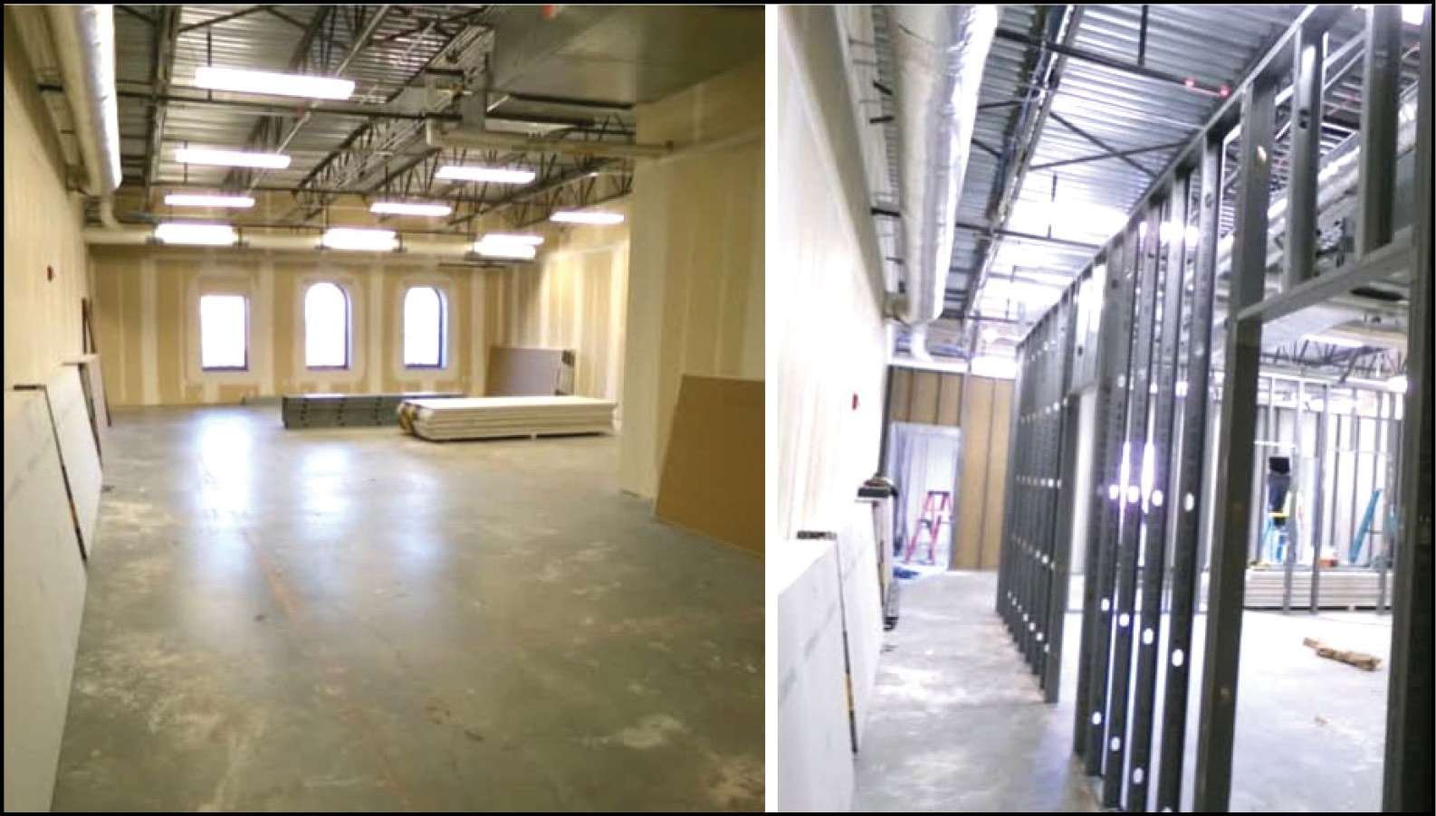 BEFORE AND DURING … The transformation of the Bryan Fire Department’s second floor space from an unfinished open area (left) to the early stages of construction with new room frameworks (right), set to become sleeping quarters for 24-hour shift firefighters.
