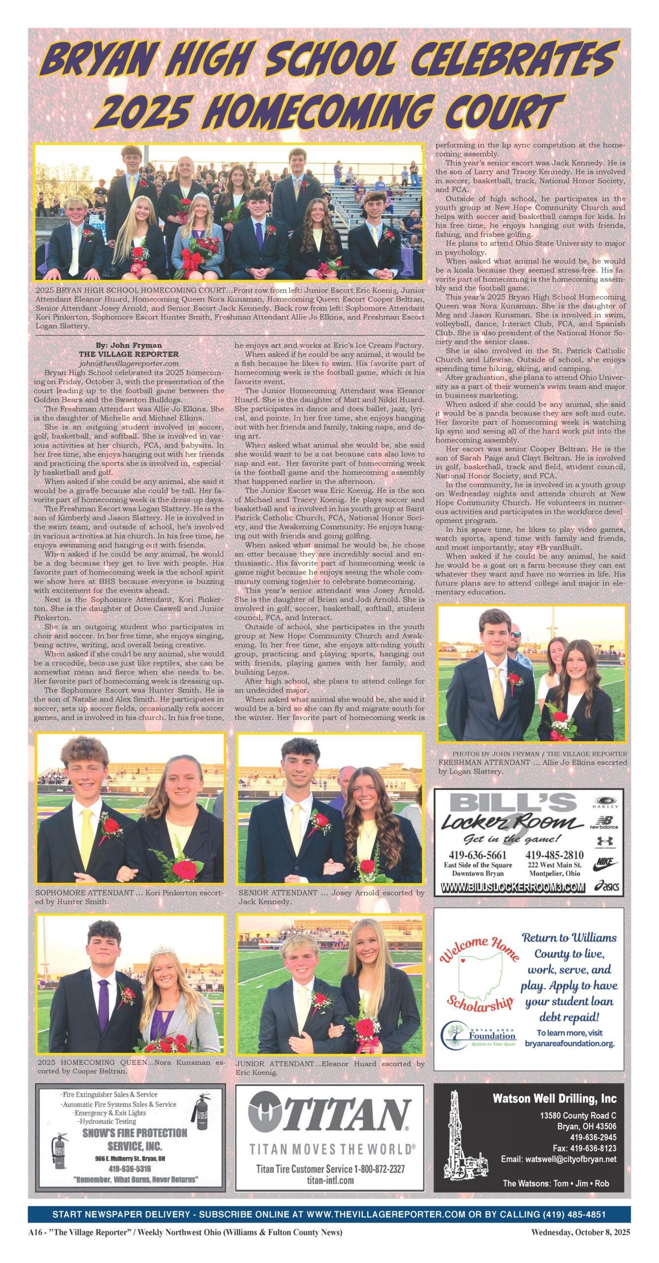This year’s 2025 Bryan High School Homecoming Queen was Nora Kunsman. She is the daughter of Meg and Jason Kunsman. She is involved in swim, volleyball, dance, Interact Club, FCA, and Spanish Club. She is also president of the National Honor Society and the senior class.