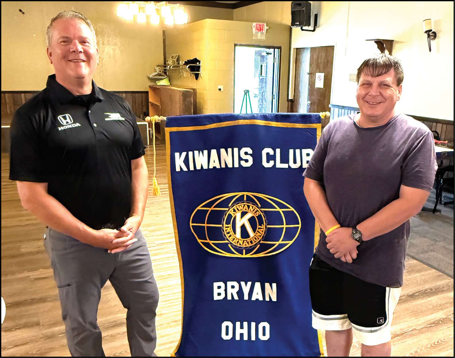 PROVIDING THE FOOD … The guest speaker at the July 16th Kiwanis meeting was Pete Herold. Mr. Herold is the Culinary Arts Instructor at Four County School. Over the summer, and occasionally during the school year, Mr. Herold is employed by Rahal Racing Team at various Indianapolis-style racing events around the country providing three meals a day for four days per event to feed all the people associated with team. The magnitude of this effort is as follows: Two 53-foot trailers that house everything necessary to undertake this mission. They assemble a huge tent in the parking lot of the venue that houses a full kitchen as well as seating for the many team members and sponsors. The racing events take place between Thursday and Sunday of a given week where assembly and then the tearing down of the infrastructure needs to take place. A typical day at an event calls for the preparation and feeding of 250 to 450 people three times a day. They are able to provide a rotating menu of 30 different items. They work approximately 17 different events a year. Mr. Herold has done this since 1996. The Rahal Racing Team is owned by Bobby Rahal, David Letterman and Michael Lanigan. Pictured left to right is Pete Herold and Kiwanian and program host Dan Cline.