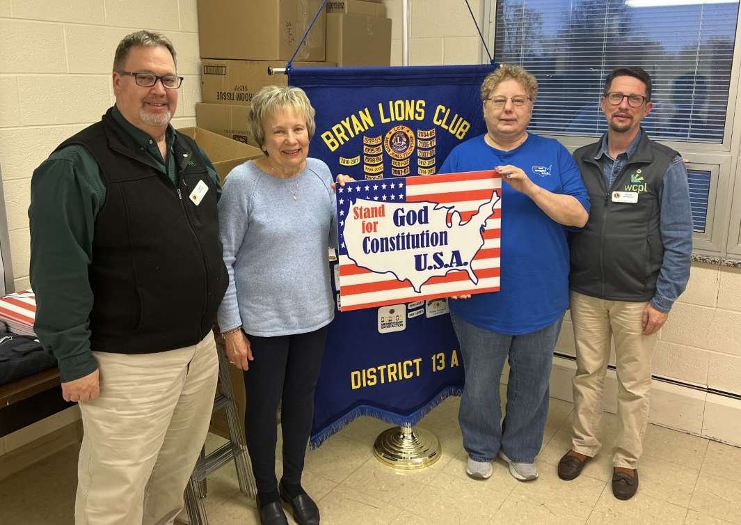 PATRIOTIC SIGNS … On March 22nd 2022 Kathy Roth and Jane Tucker-Haush provided the Bryan Lions Club with information regarding the “God-Constitution-USA” signs which are appearing all over Northwest Ohio and beyond. Roth began the yard sign campaign which has now spread regionally and nationally. Pictured left to right are program chairman Lion Larry Harsila, Kathy Roth, Jane Tucker-Hausch and Bryan Lions Club President Denver Henderson. (PHOTO PROVIDED)