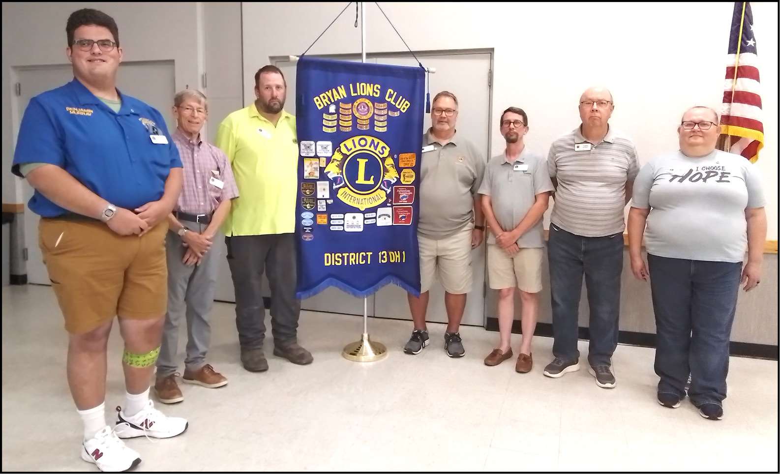 NEW LEADERSHIP … Bryan Lions leaders have been inducted for the 2025-2026 club year. Left to right are Ben Murray, Vice President, Mic McKarns, Secretary, Matt Keck, President, Larry Harsila, Past President/Membership, Denver Henderson III, Director/Membership, Tom Barnes, Director, and Lisa Keck, Director. Not pictured are Doug Saul, Treasurer and Pam Barnes, Director. Also, (below photo) new Lions member Josh Motter (left) is pictured with sponsor Lion Mic McKarns.