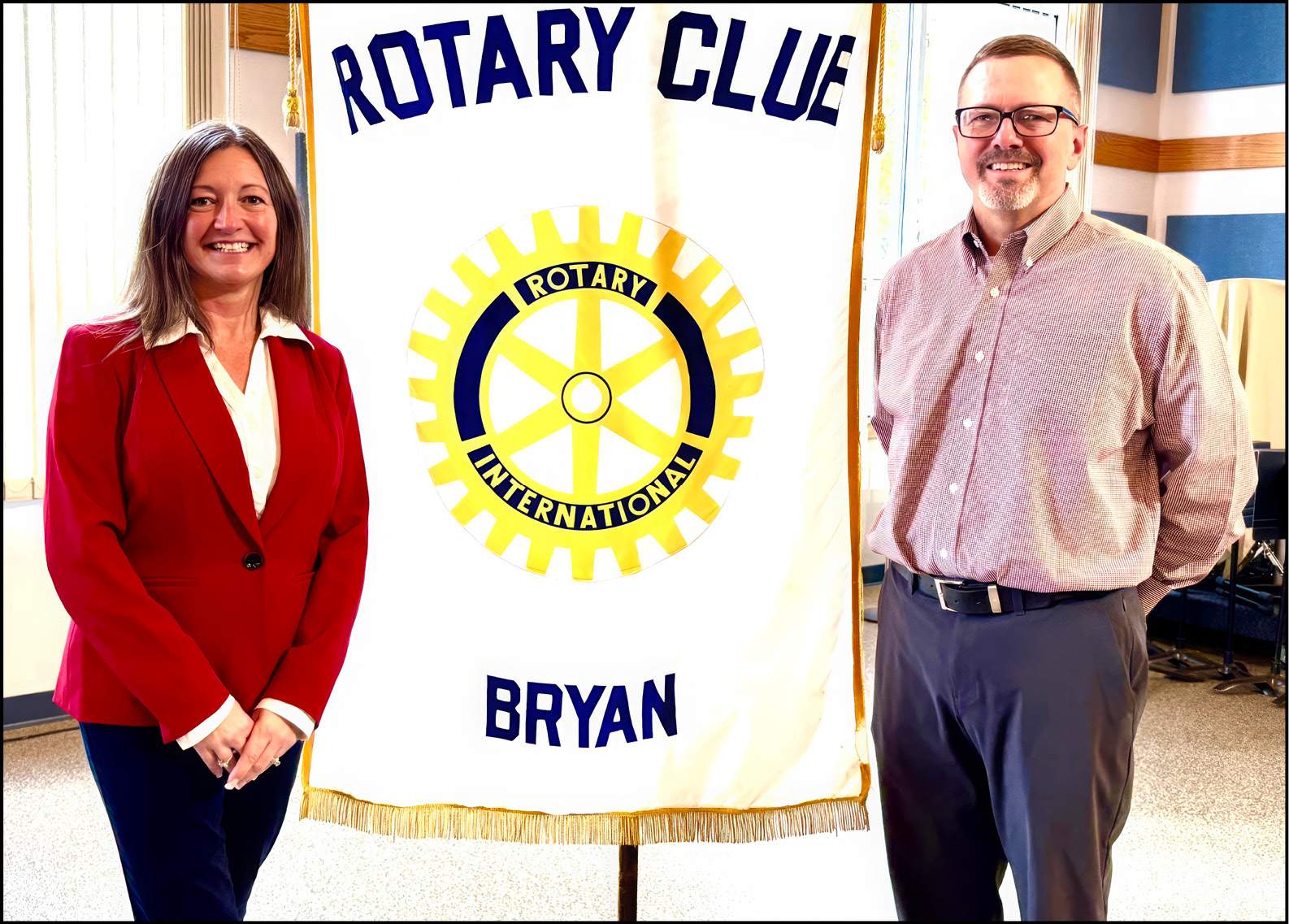 VETERANS DAY … The Bryan Rotary Club marked Veteran’s Day with honoring invited guests who served in the armed forces. Guest speaker Brad Bowers shared photos and stories about his father who served in Europe during World War II in 1944-45. After the war, his father confiscated several cameras left behind by German soldiers. He had the film, that was left in the cameras, developed and he discovered fascinating and rare photos of the war. His father meticulously identified where many of the photos were taken, Omaha Beach, Amsterdam, Le Havre, and Germany. Recently, Bowers and his wife went to Europe and visited many of these sites and photographed them today. On Omaha beach there are still gun outposts and German barracks. There is an American cemetery on land donated by the French government. It was quite a contrast between the photos taken 80 years ago and the redevelopment of today. Pictured is Rotarian Misty King and speaker Brad Bowers.