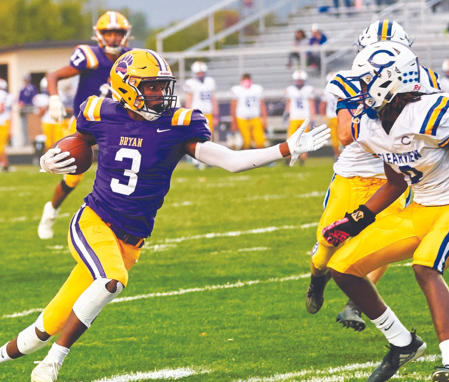 ELUDING THE DEFENSE … Bryan receiver Jay Damron looks for the end zone after a first quarter catch. VIEW 681 PHOTOS OF THIS CONTEST ONLINE FOR FREE AT WWW.THEVILLAGEREPORTER.COM. (PHOTO BY RICH HARDING, STAFF)
