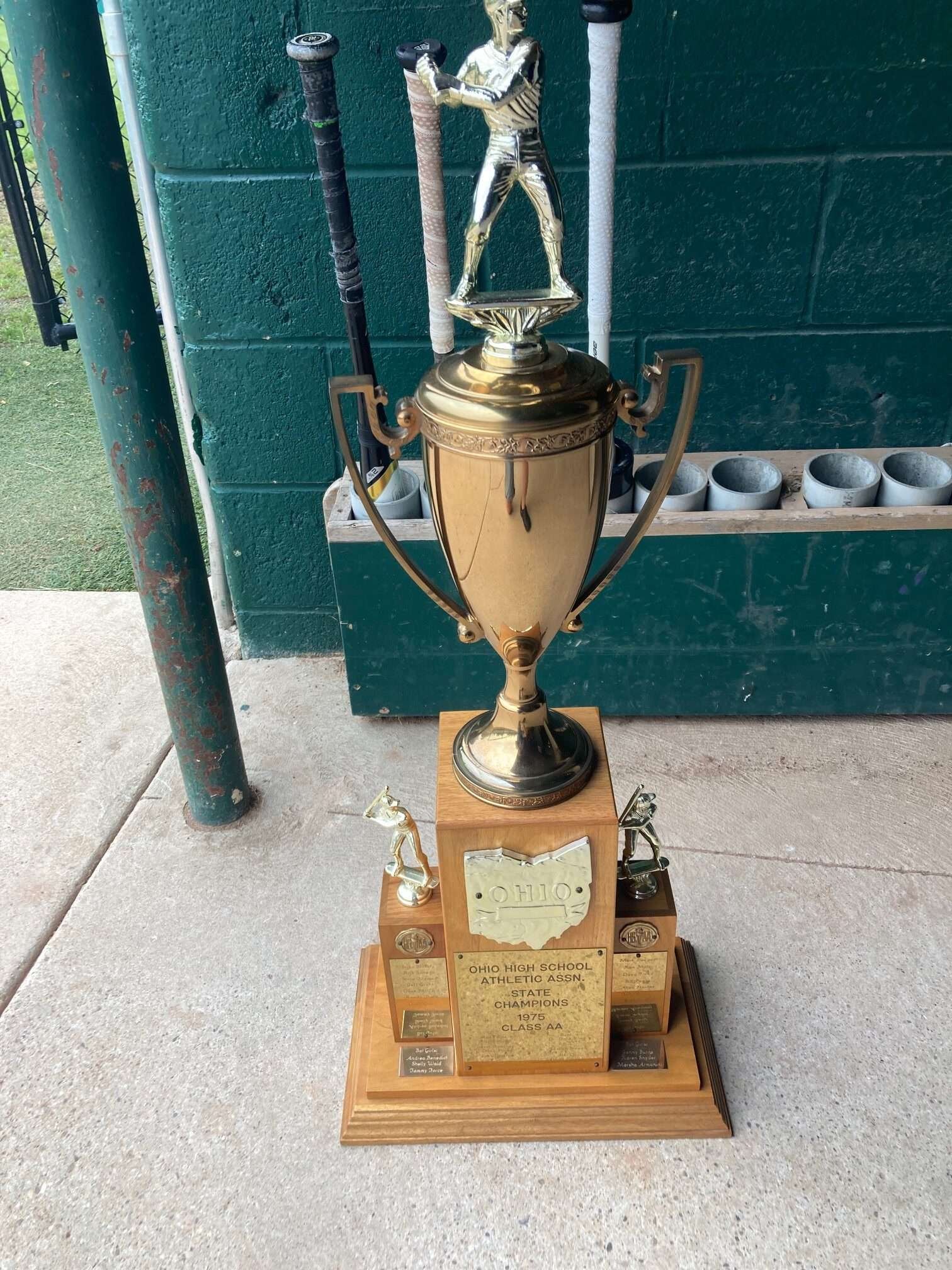 THE BIG PRIZE … The 1975 Class AA State Baseball Championship Trophy won by Bryan is proudly displayed in the Golden Bears dugout.