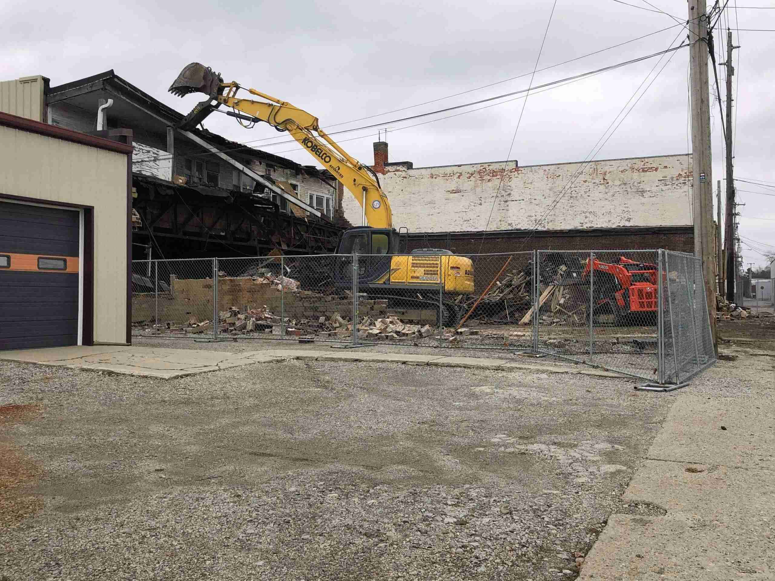 After the demolition was scheduled, a big section of the roof came off the building making it even clearer that it did need to be demolished. The demolition began on Friday, November 27, the day after Thanksgiving, at the back side of the buildings and moved around to the west side before completing the job during the first week in December.