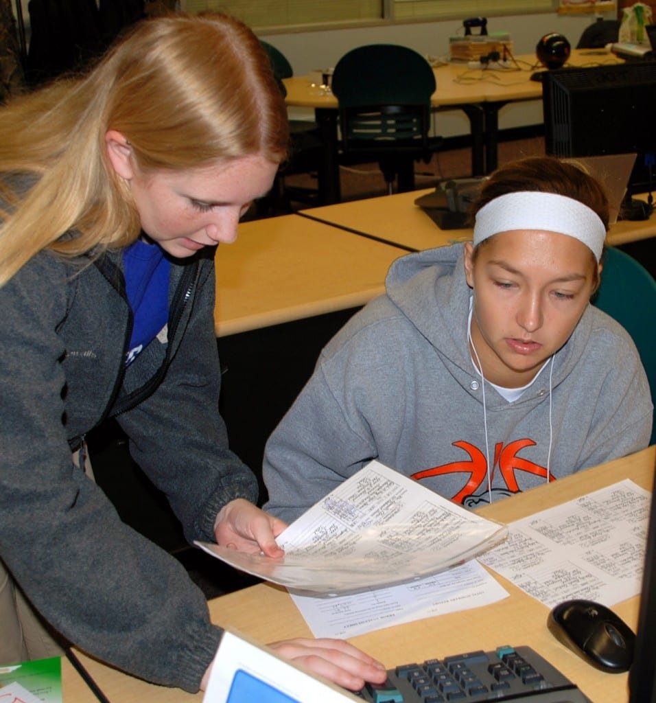 Accounting & Business Management lab … Left to right: Career Center student Jennifer Kowalis (Edon) with Tinora sophomore Hope Hornish.