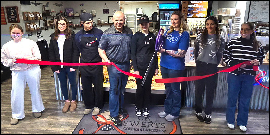 A SWEET CELEBRATION … CK Sweets Owner Cat Kania (center right) is joined by husband Derek (center left) and daughter Kylie, as she cuts the ribbon at a grand reopening of its Swanton home, celebrating six years of progress since the business opened. Also pictured are (from left) Hanah Faber (an original 2020 employee), Lexi Faber, Wyatt Gibbons, Clair Smith, and Riley Bellner (an original 2020 employee).
