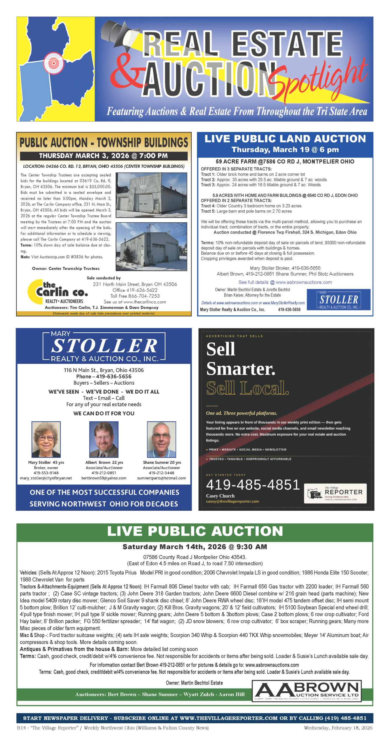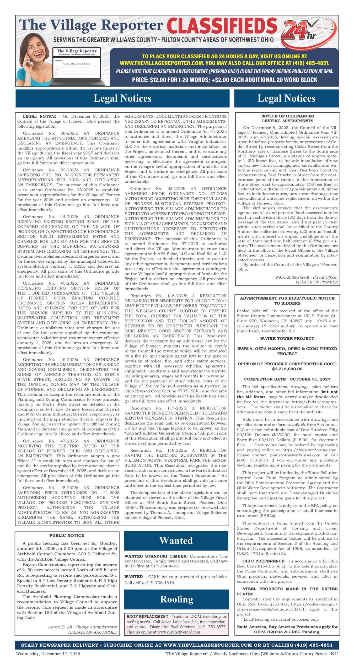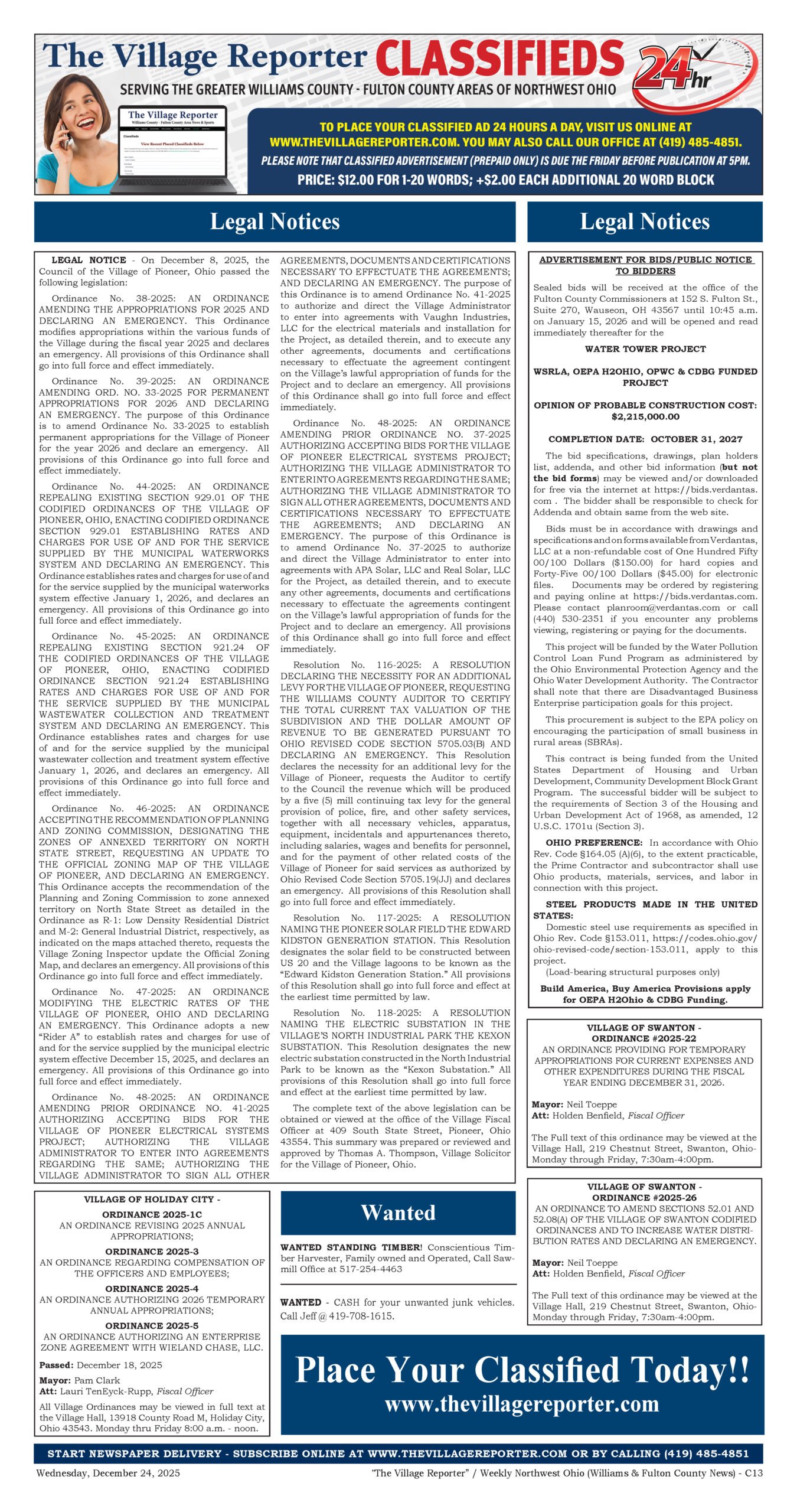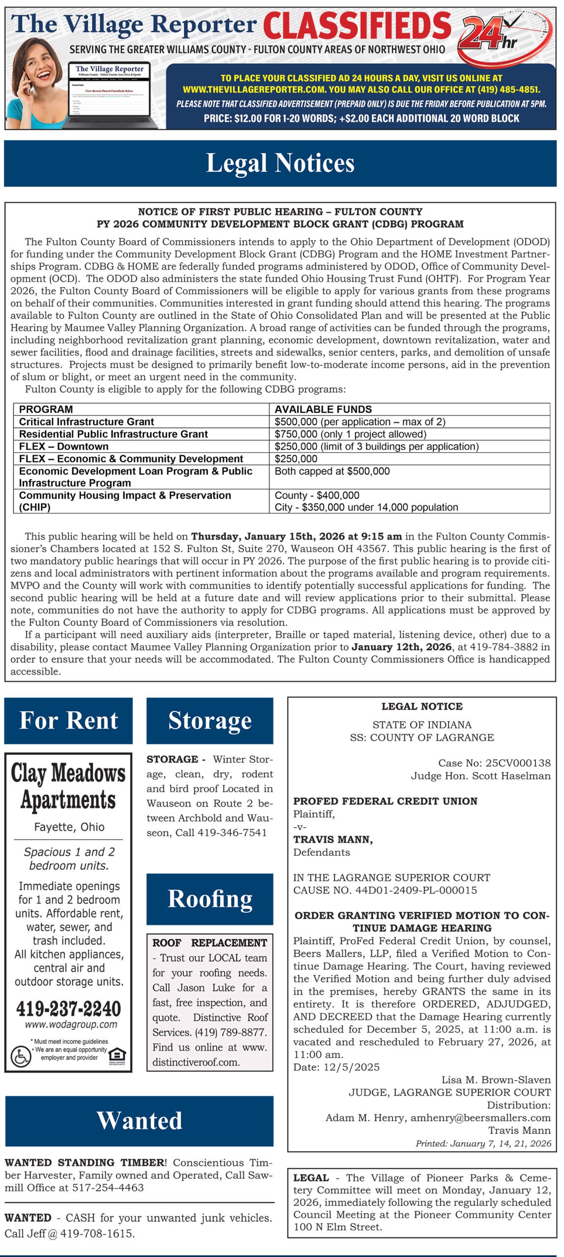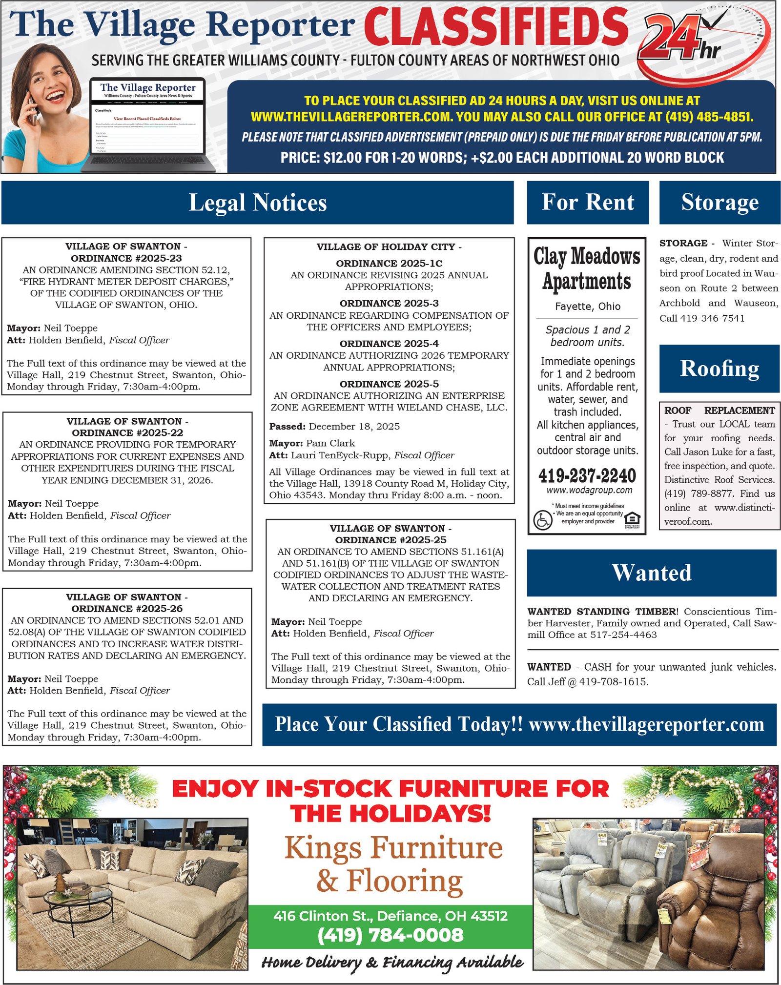 Place a Classified Ad which will appear within our weekly Print Edition, E-Edition and for free viewing on our website. If your Classified Ad contains an image or is larger than 80 words, please contact us at 419-485-4851 or publisher@thevillagereporter.com for assistance.