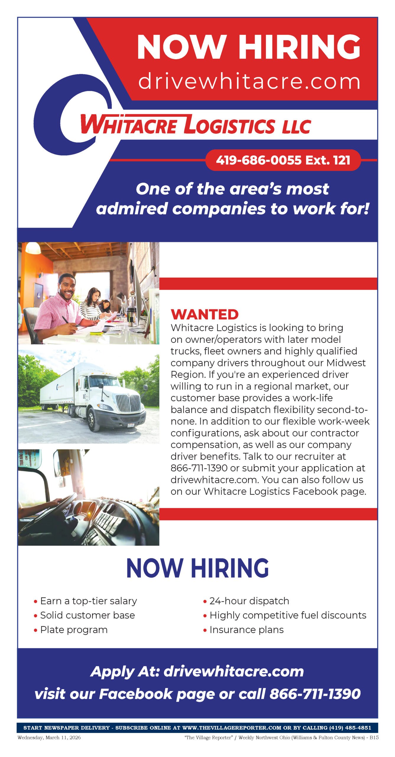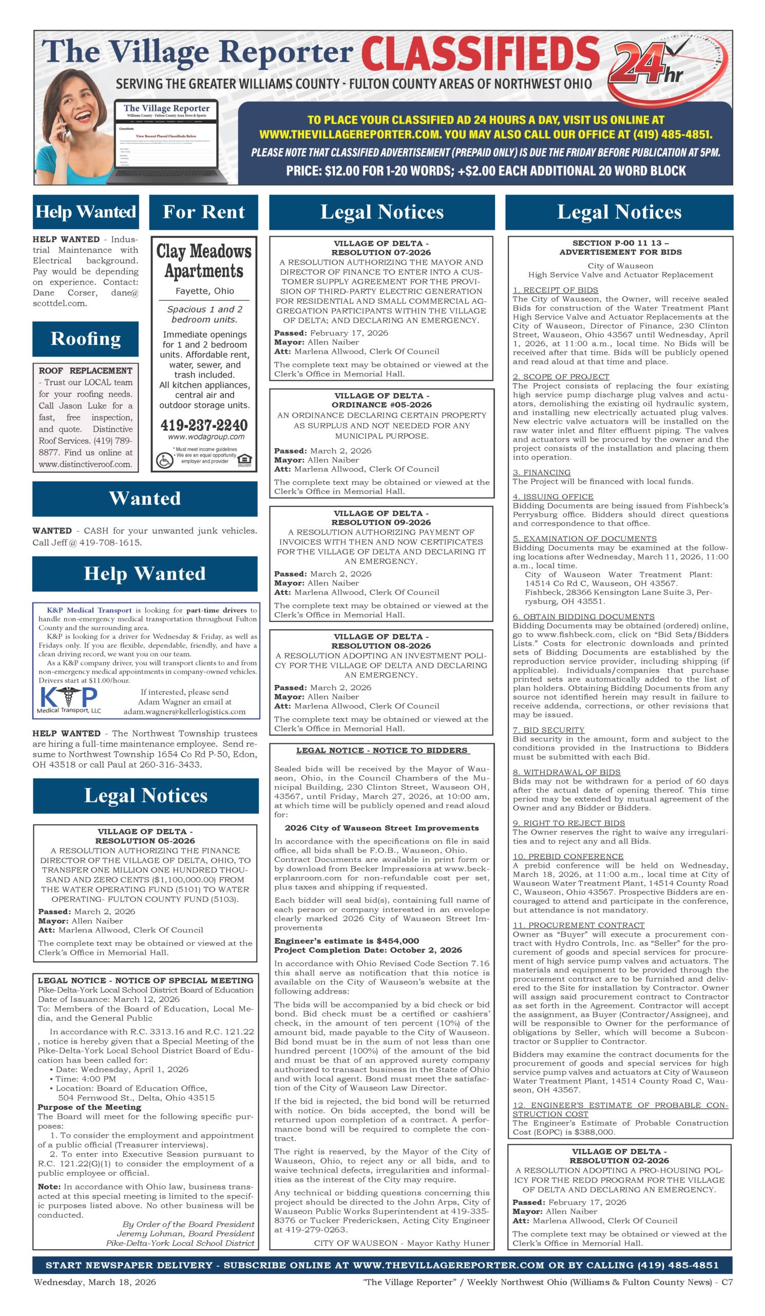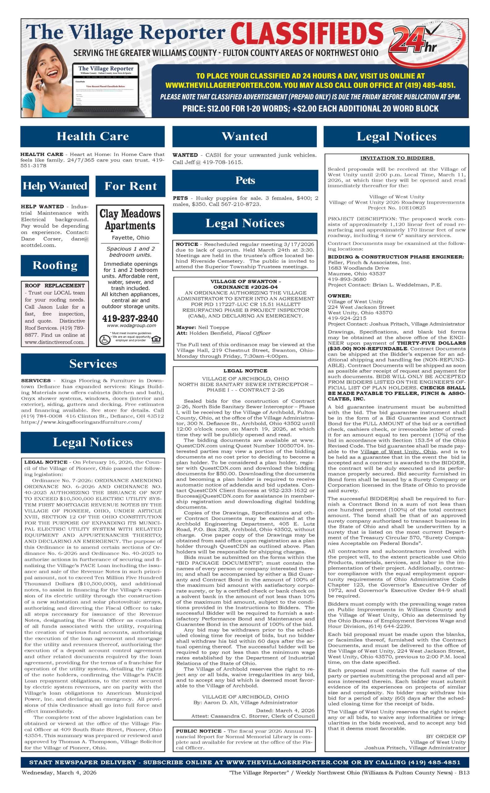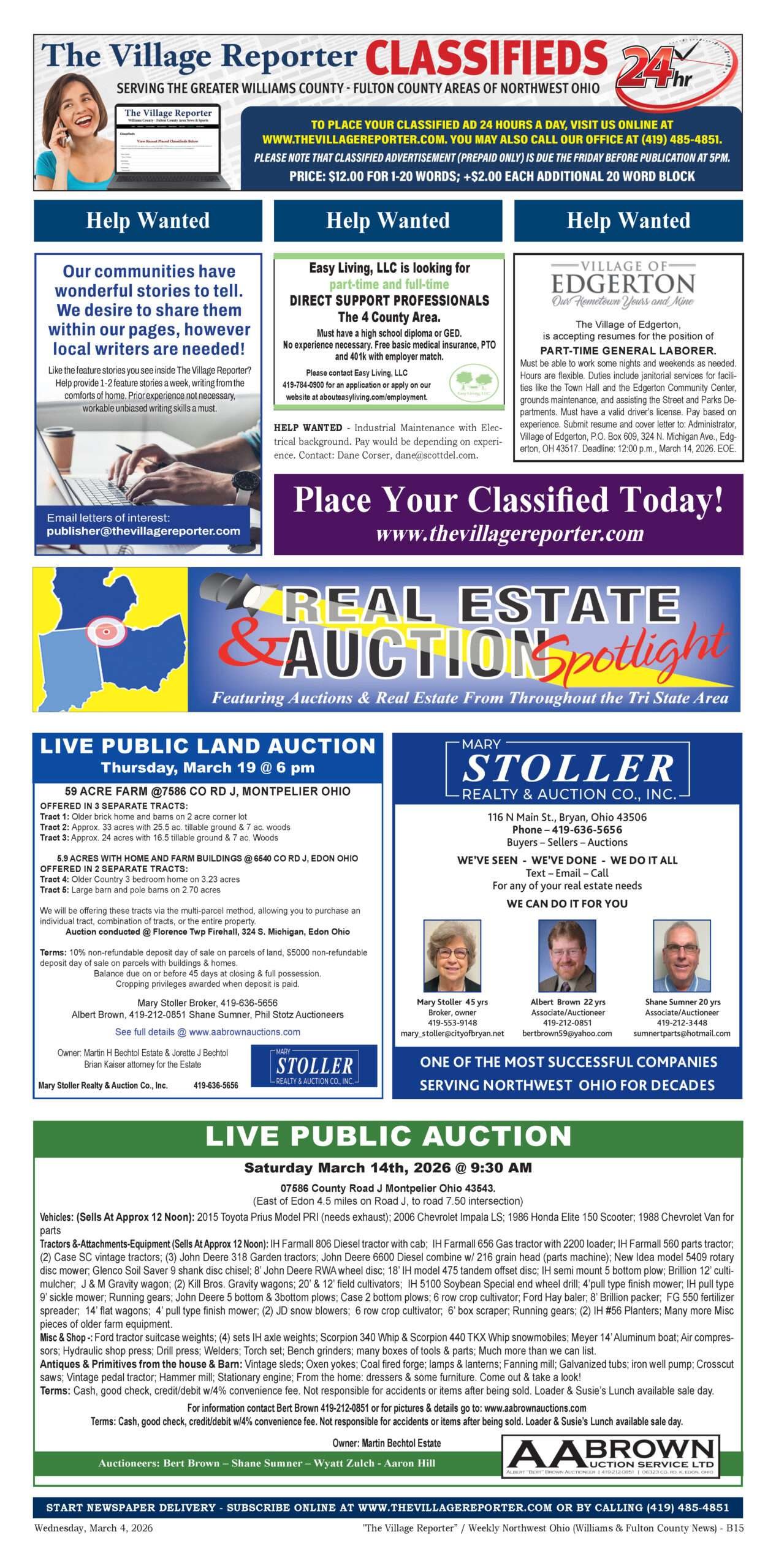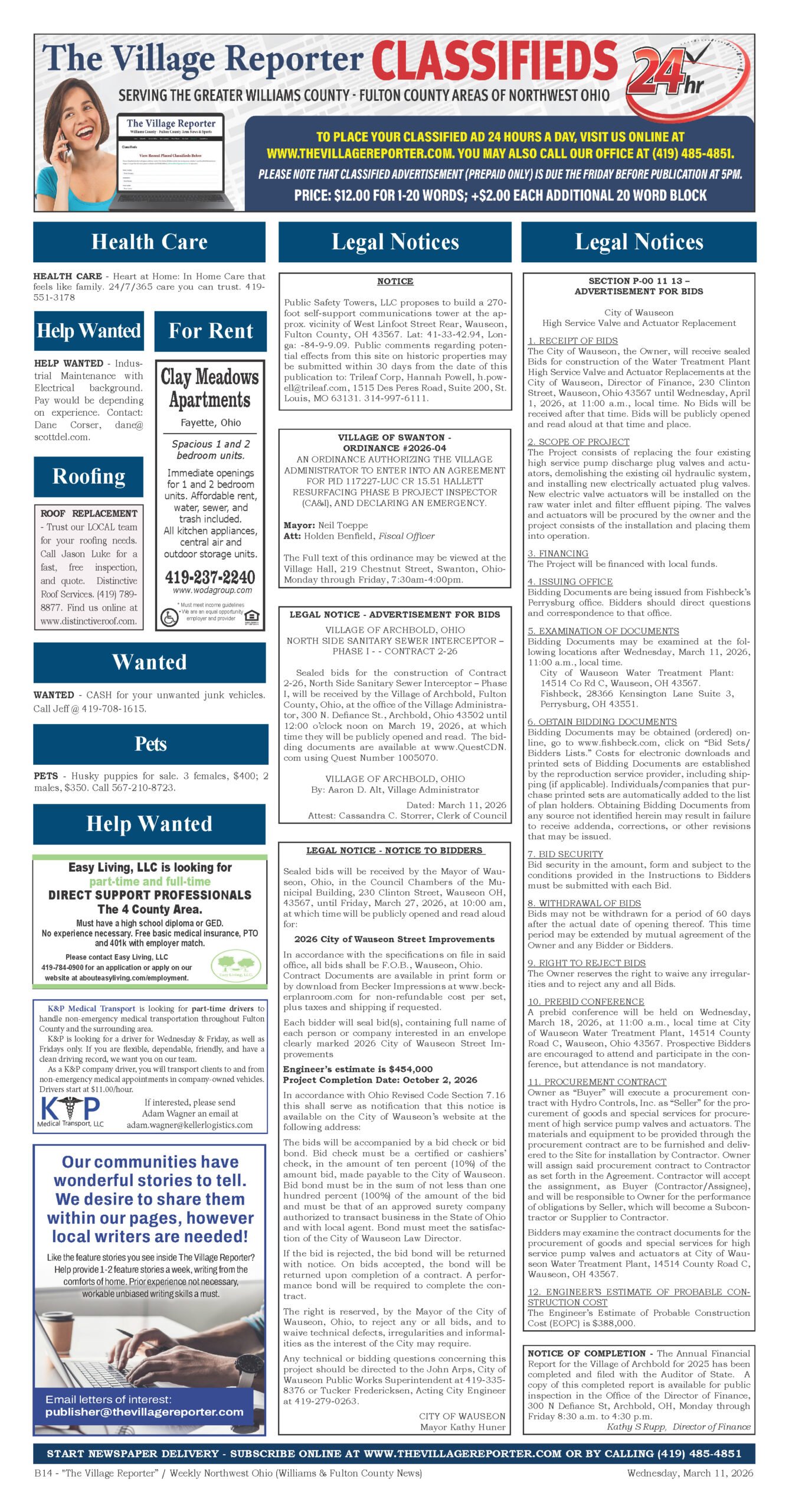 Place a Classified Ad which will appear within our weekly Print Edition, E-Edition and for free viewing on our website. If your Classified Ad contains an image or is larger than 80 words, please contact us at 419-485-4851 or publisher@thevillagereporter.com for assistance.