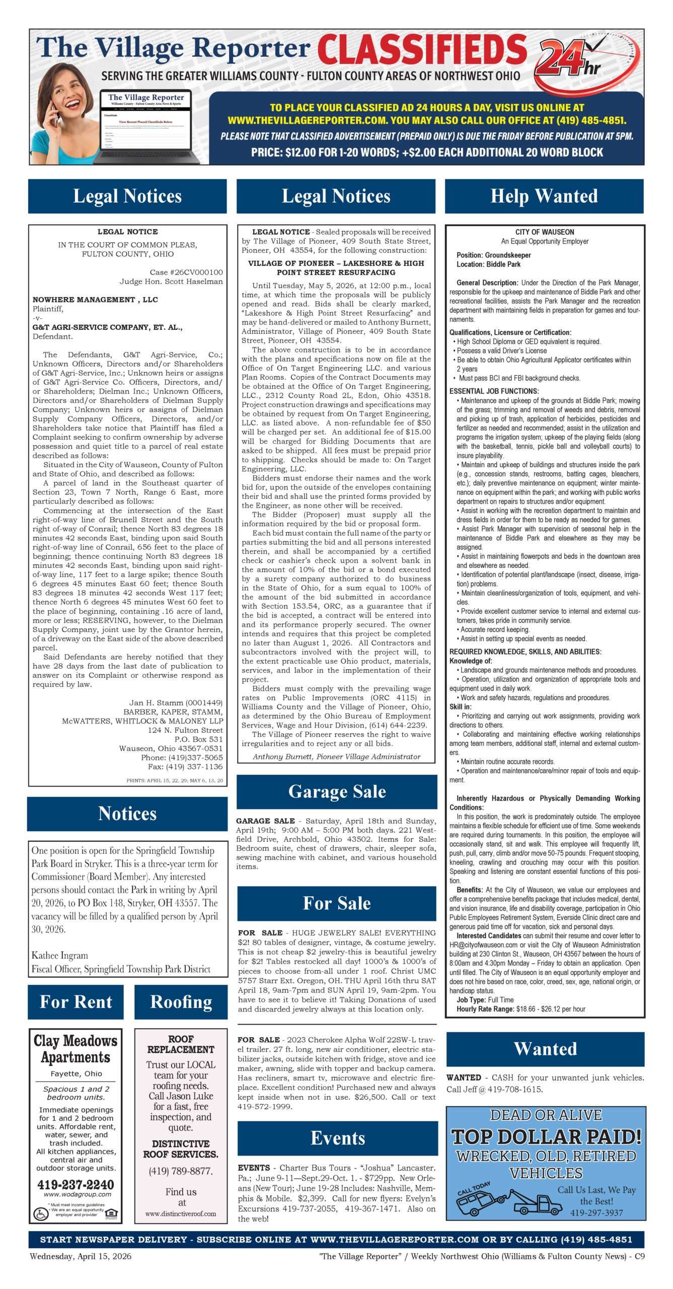 For ads with images or over 80 words, call (419) 485-4851 or email publisher @ thevillagereporter.com