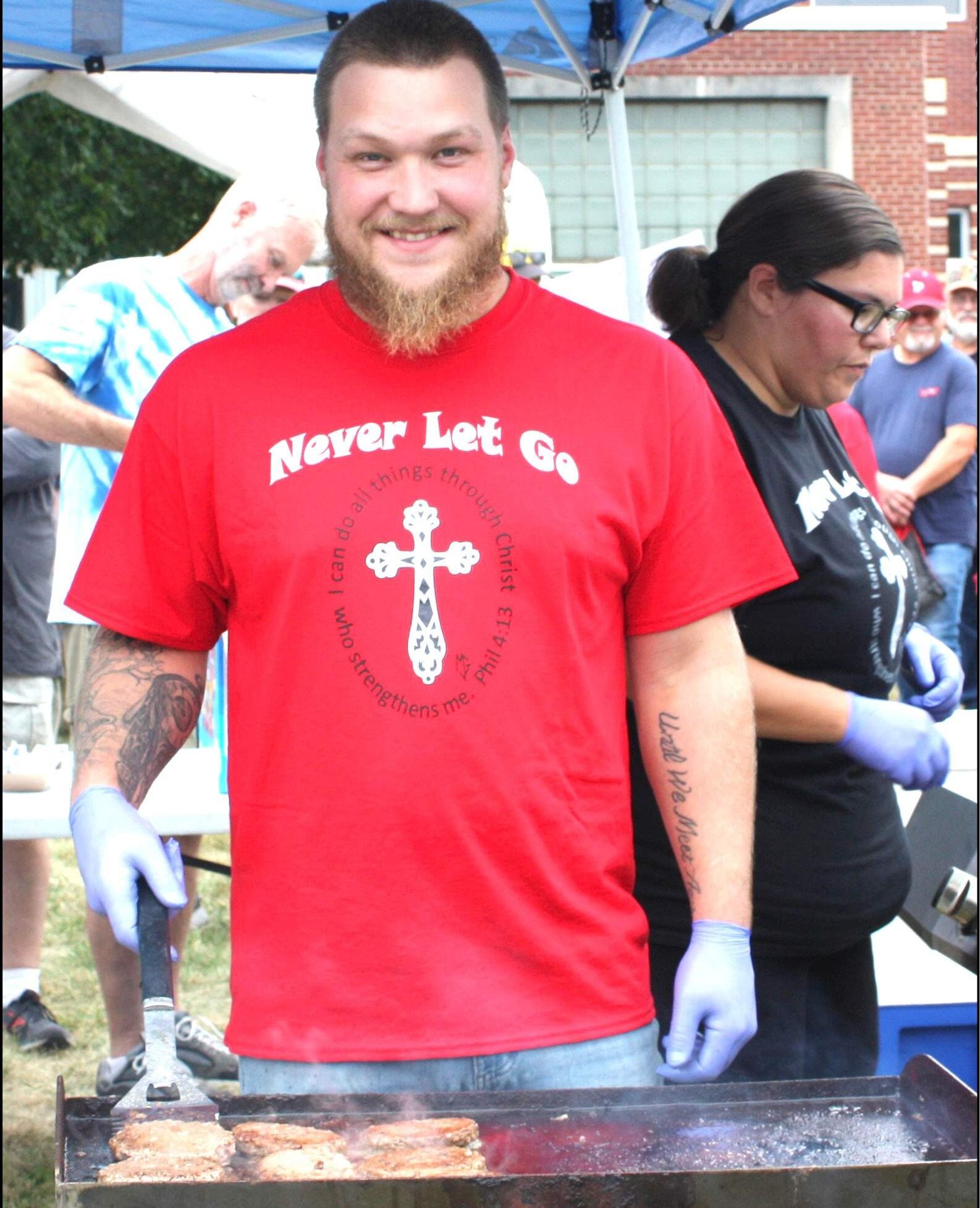 SERVING FOOD … Never Let Go Ministries volunteers serve hot sausage sandwiches to the Edgerton community gathered.