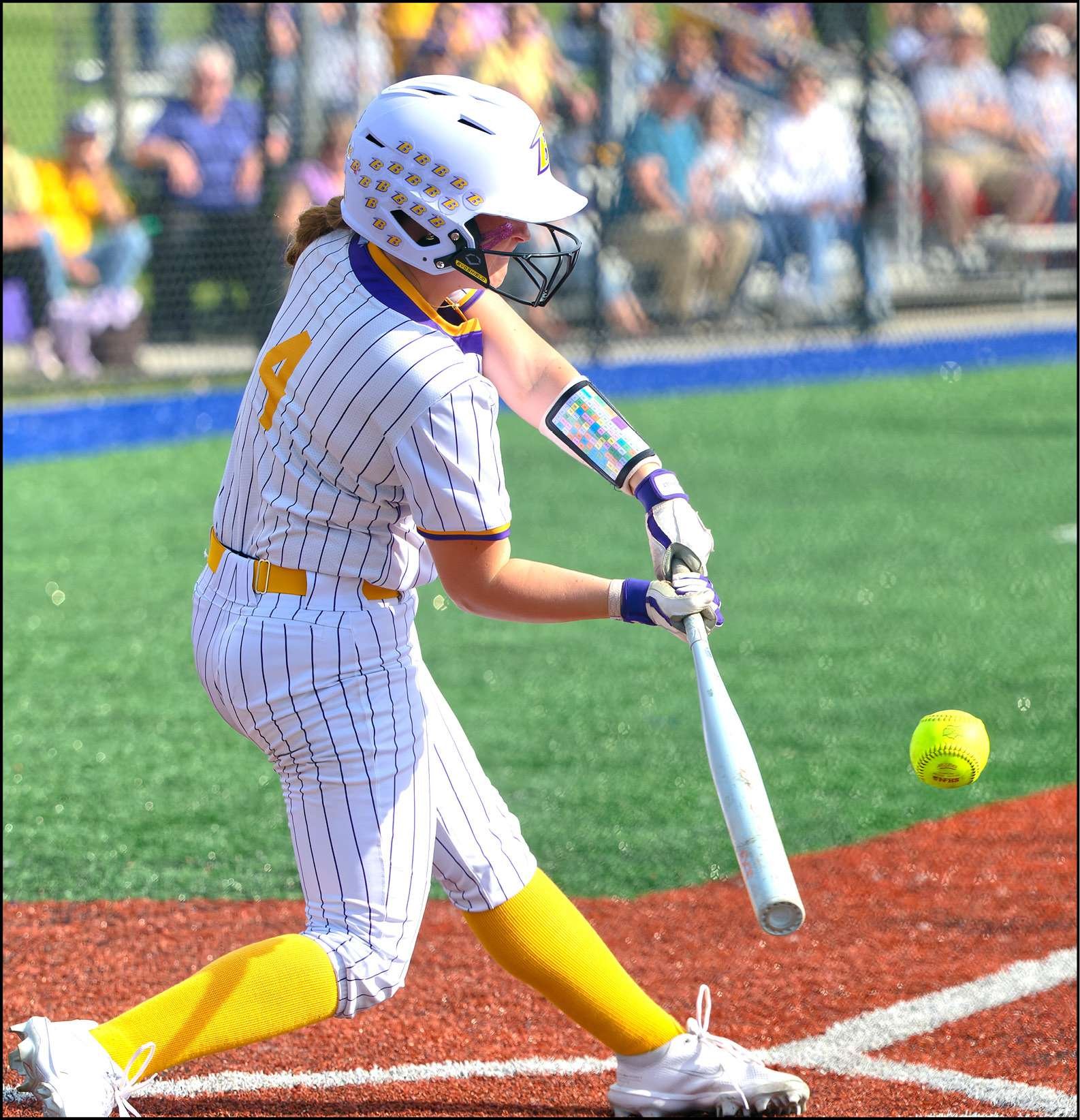 LEADING HITTER … Amiyah Langham clubs a single to center, one of her two hits on the day.