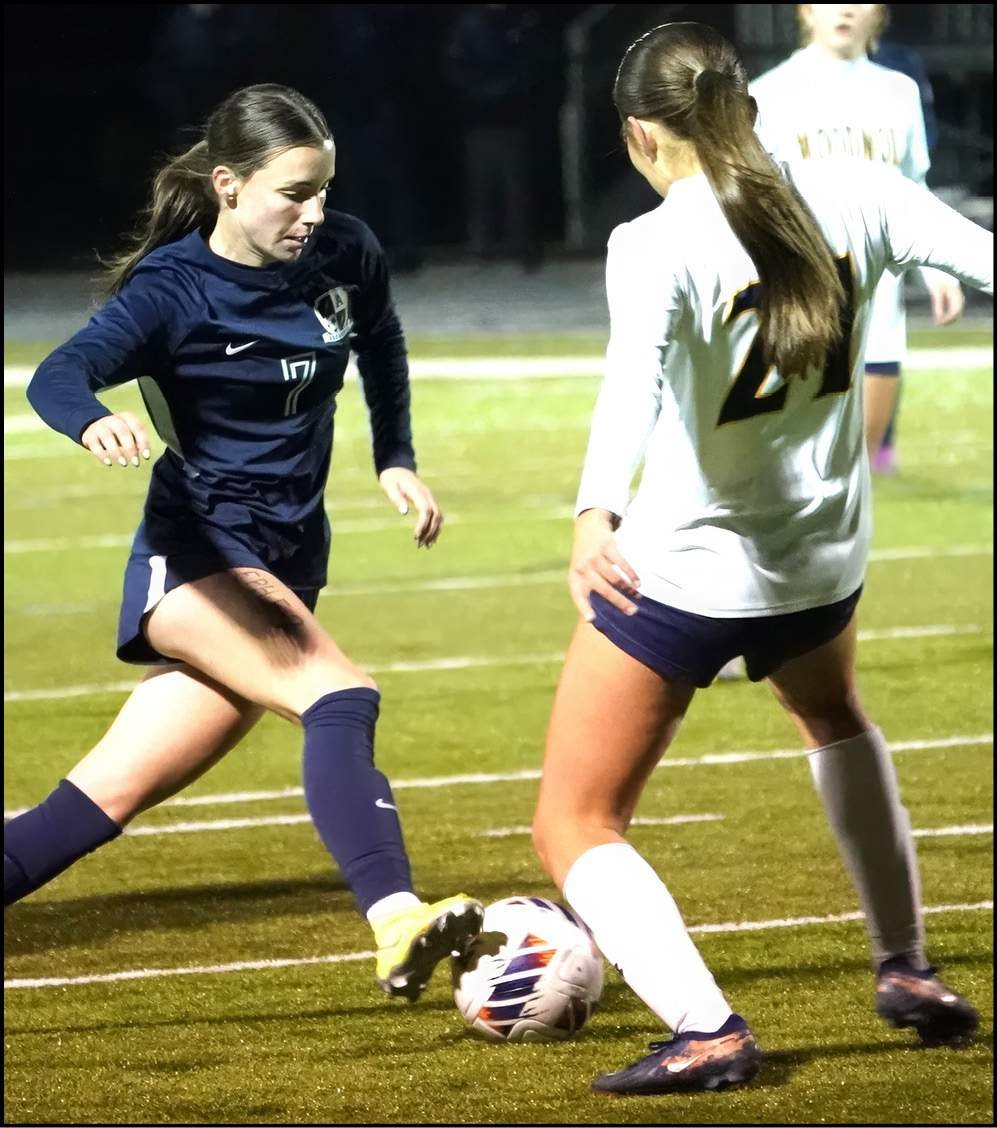 EARLY SCORE … Delilah Chapa drives home a free kick to give the Bluestreaks a 1-0 lead over Woodmore.
