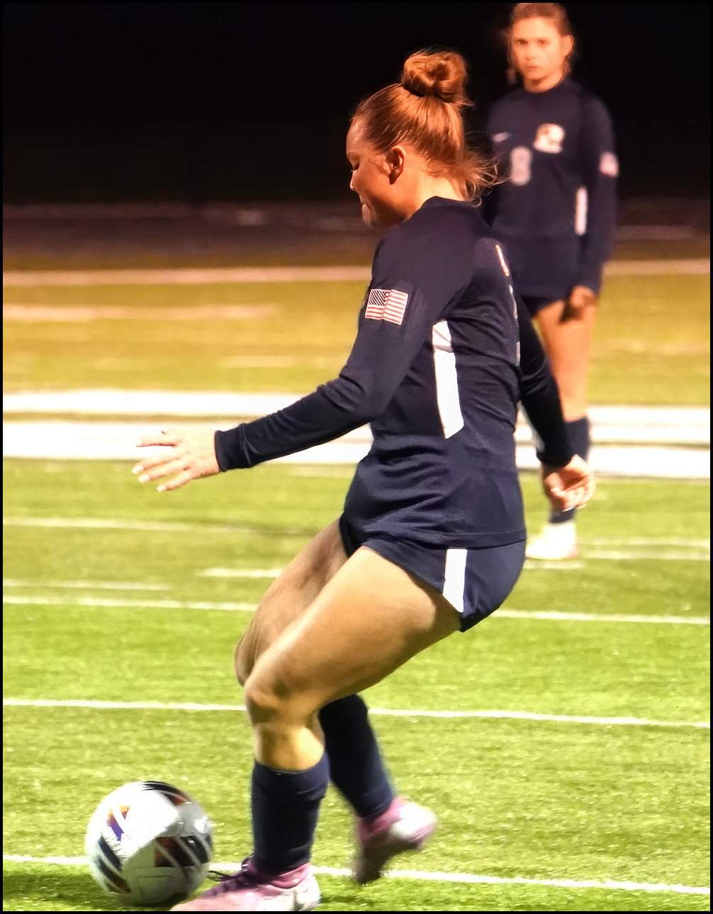 EARLY SCORE … Delilah Chapa drives home a free kick to give the Bluestreaks a 1-0 lead over Woodmore.