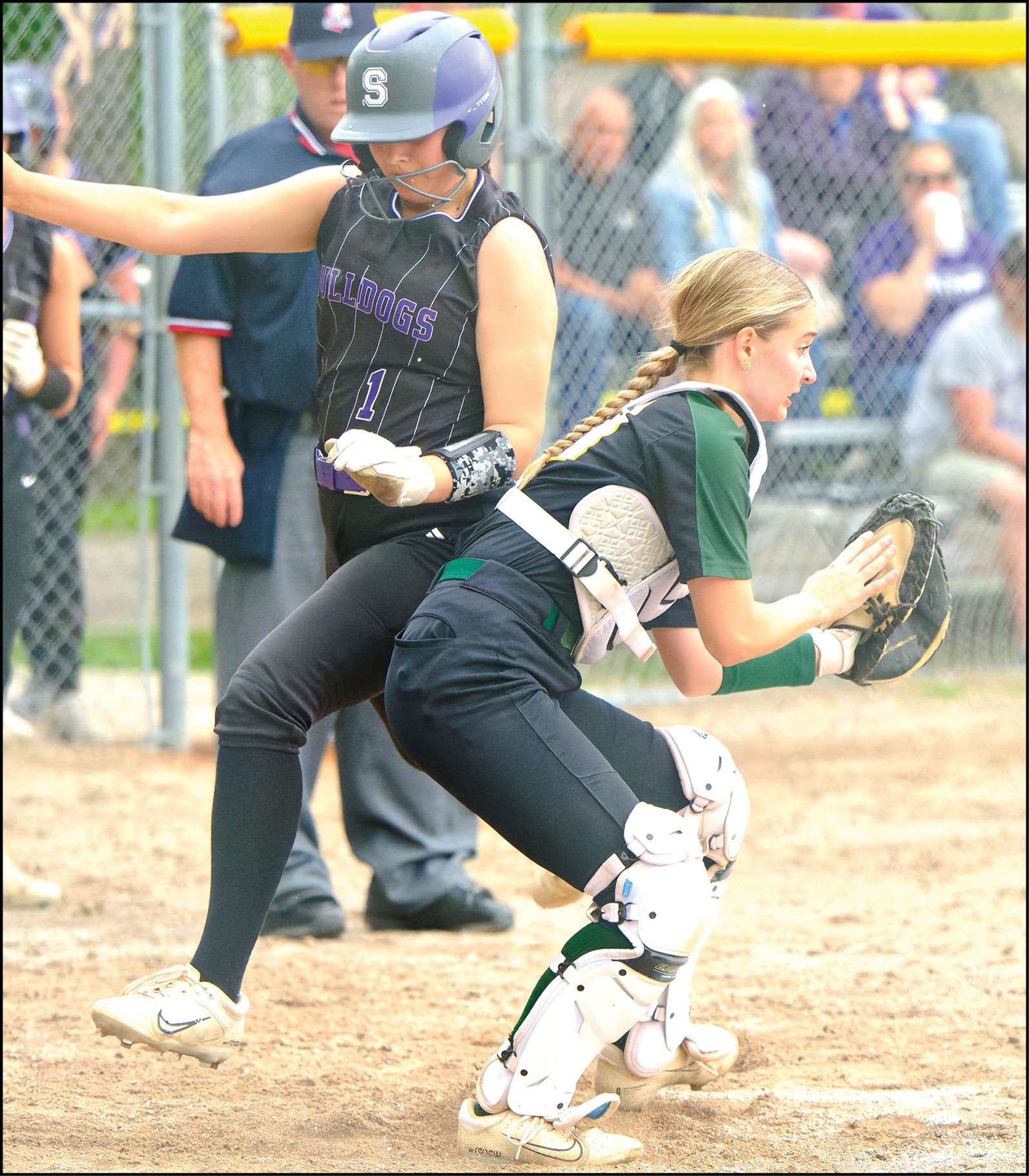 ADDING TO THE RALLY … Swanton’s Adriana Elliott steps around the catcher to score a run during the Bulldogs eight-run opening frame.