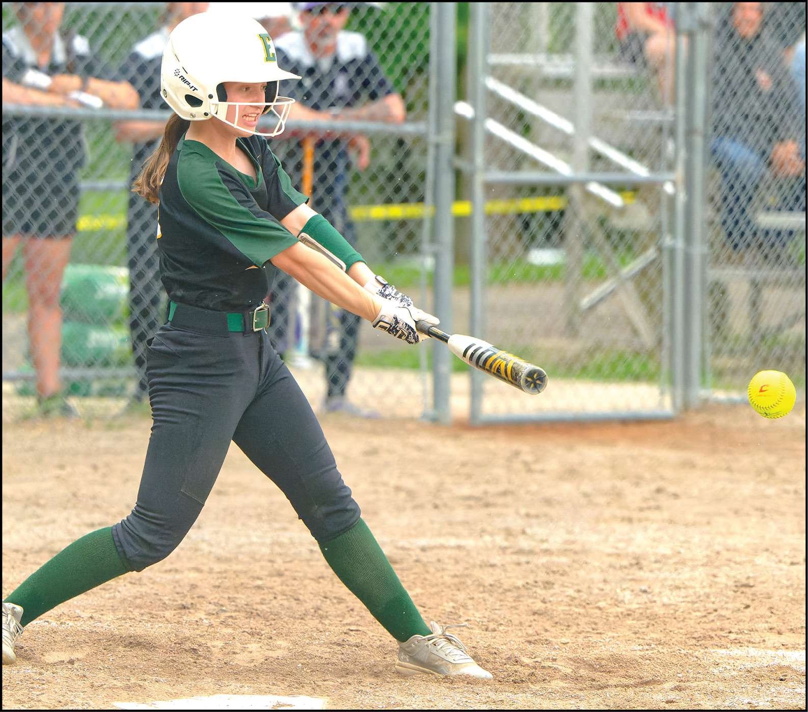 SECTIONAL SOFTBALL … Alex Paulson of Evergreen clubs a second inning single in the rain at Swanton’s Memorial Park.