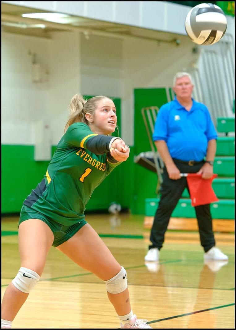 TOURNAMENT VOLLEYBALL … Evergreen defensive specialist Ireland Smallman records a dig in the Vikings’ district semifinal versus Archbold.