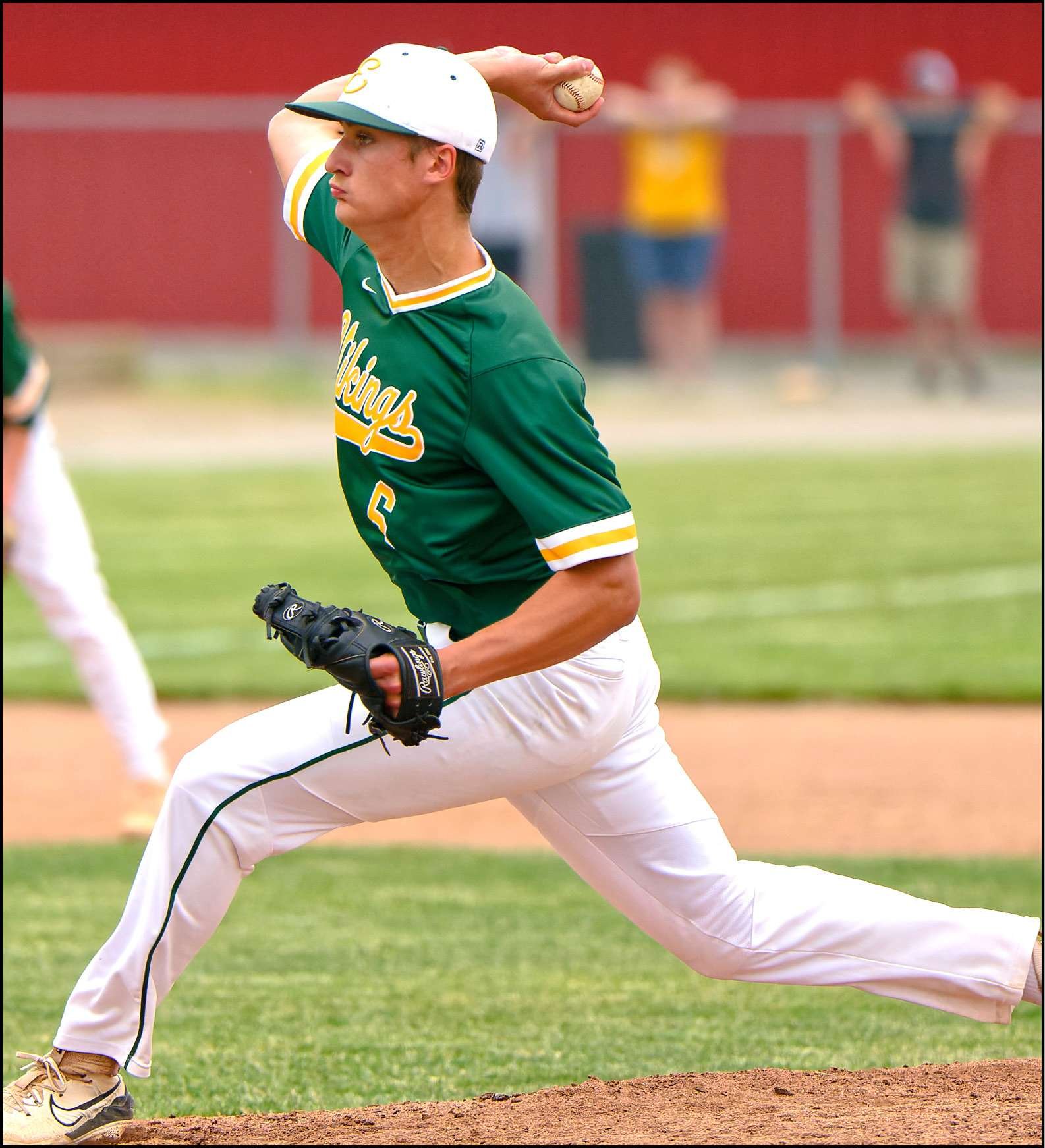 COMPLETE GAME … Evergreen hurler Nolan Hudik fires a pitch in Wednesday’s regional semifinal win over Colonel Crawford. Hudik went the distance for the Vikings allowing five hits with six strikeouts.