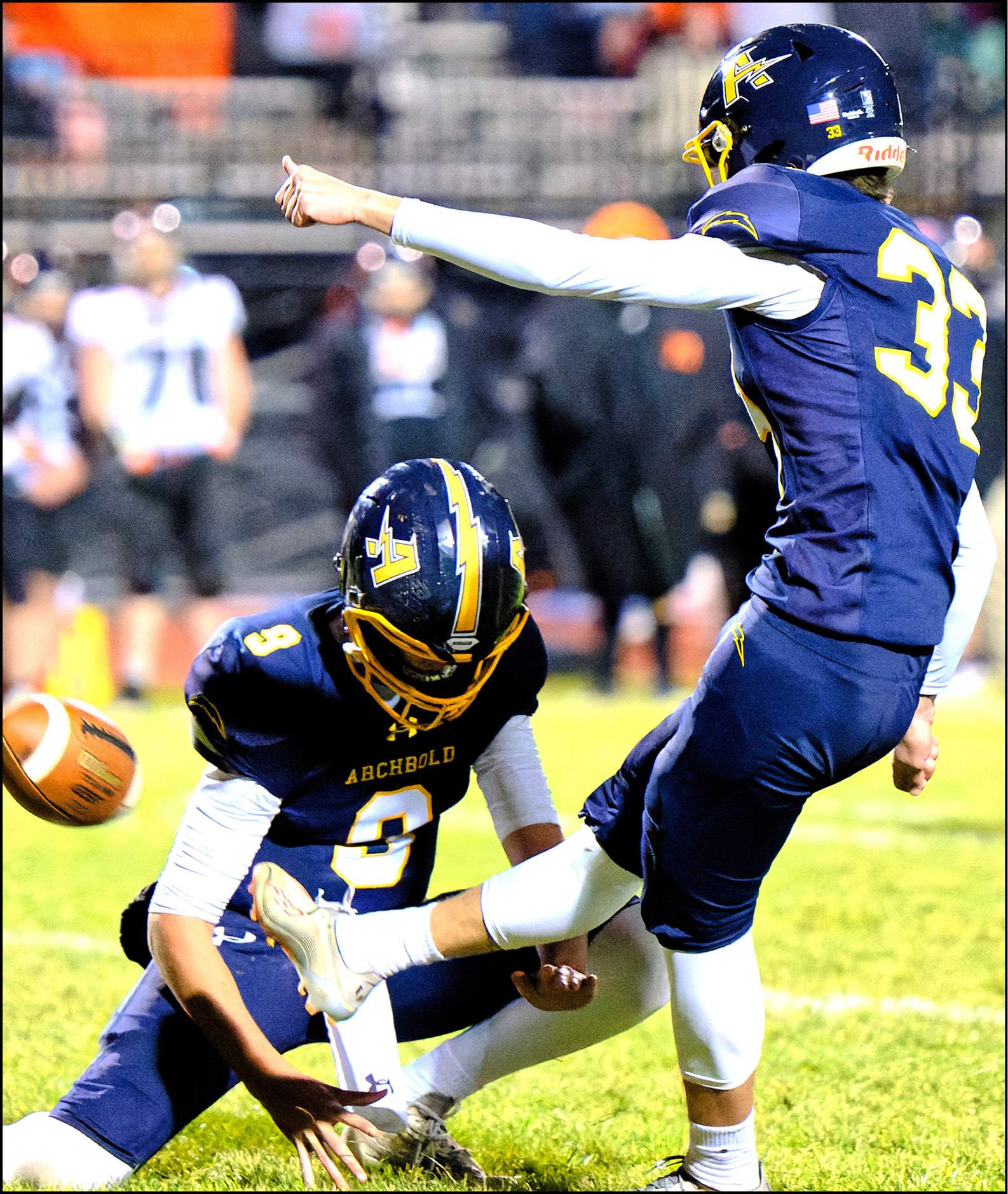 SPLITTING THE UPRIGHTS … Archbold’s Quinn Sauder drives home a 33-yard field goal in the first quarter to push the Bluestreaks’ lead to 10-0.