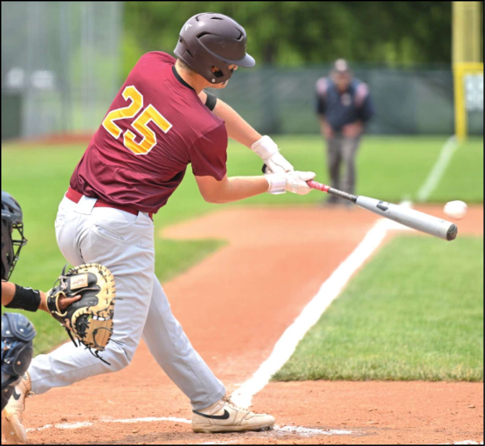 D7 DISTRICT FINAL … Montpelier’s Malachi Smeltzer smacks a single to left field in Saturday’s district final versus Edgerton.