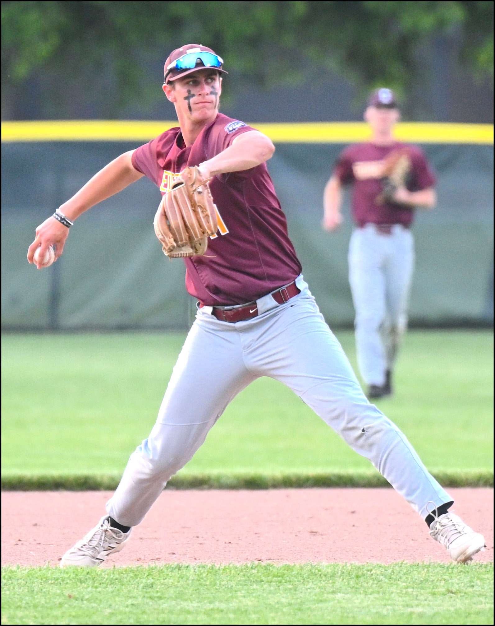 DISTRICT SEMIFINALS … Edgerton’s Cory Herman throws to first after fielding a grounder in the Bulldogs’ district semifinal win over Hilltop.