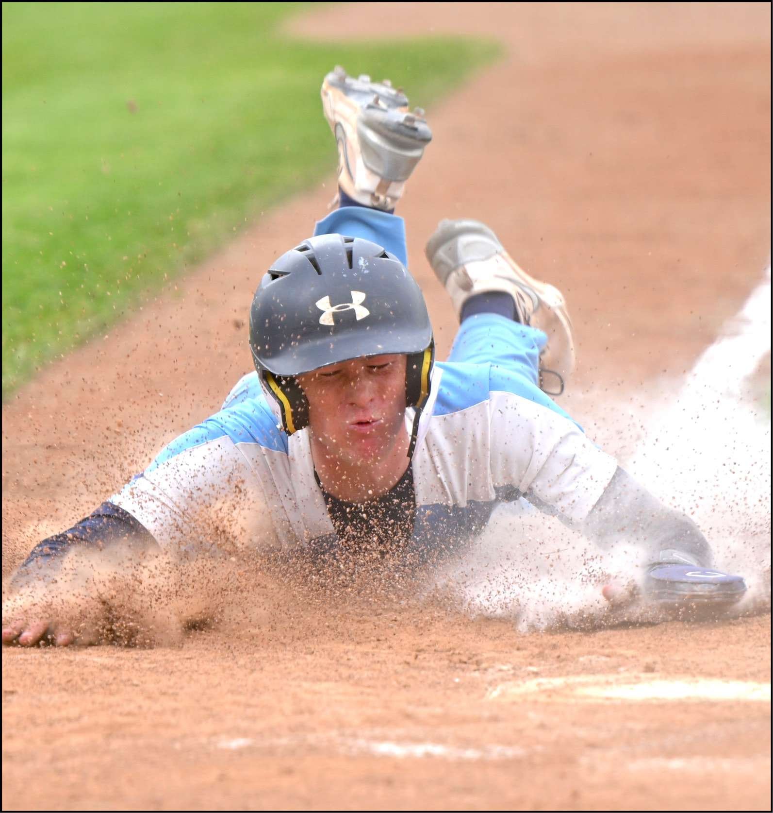 HEADFIRST SLIDE … Montpelier’s Kenneth Smeltzer slides into home with a run in the Locos’ 7-3 win over Edon in the Division VII district semifinals.