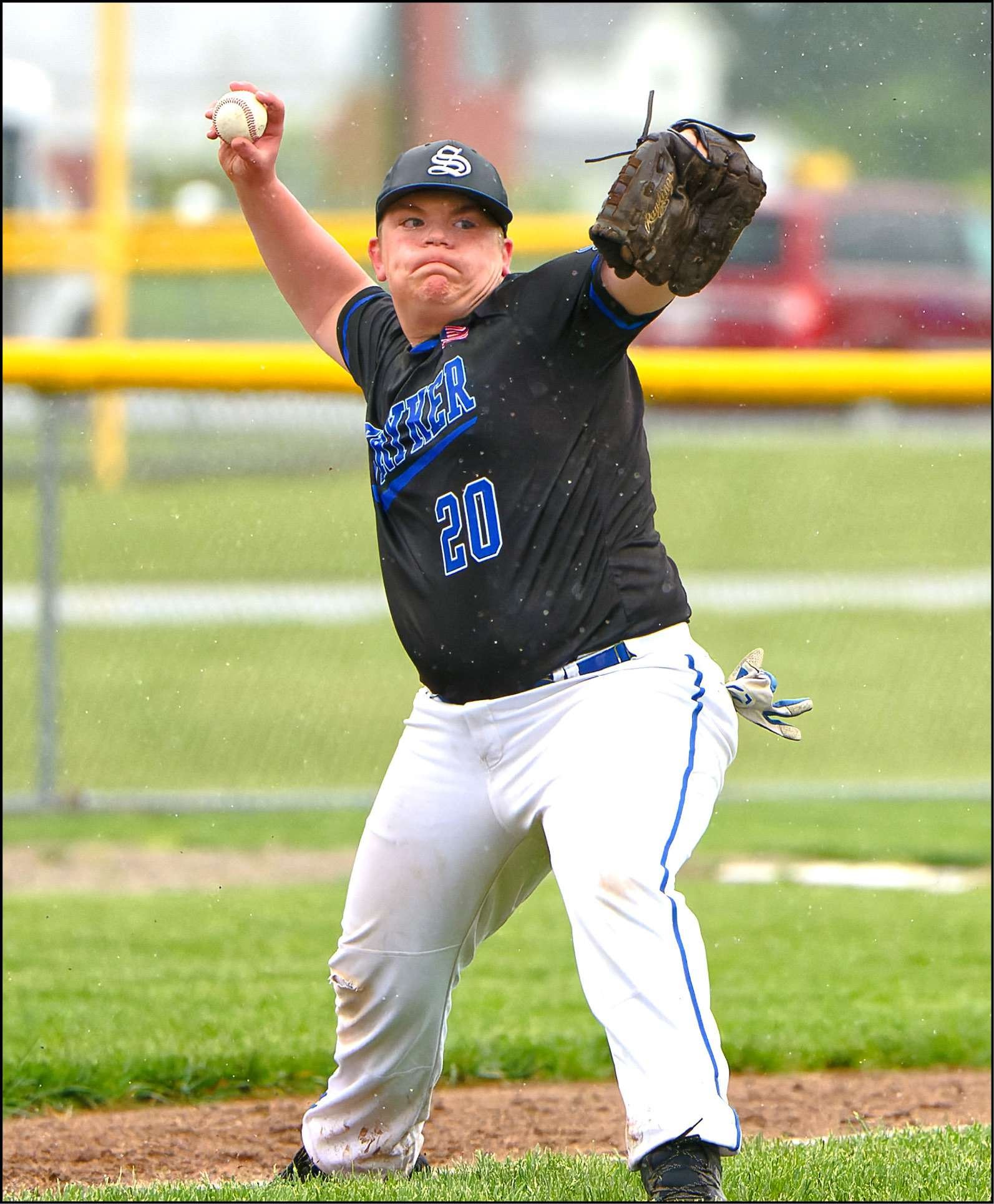 HOT CORNER … Stryker’s Cooper Stuckey unloads to first base after scooping up a grounder at third.