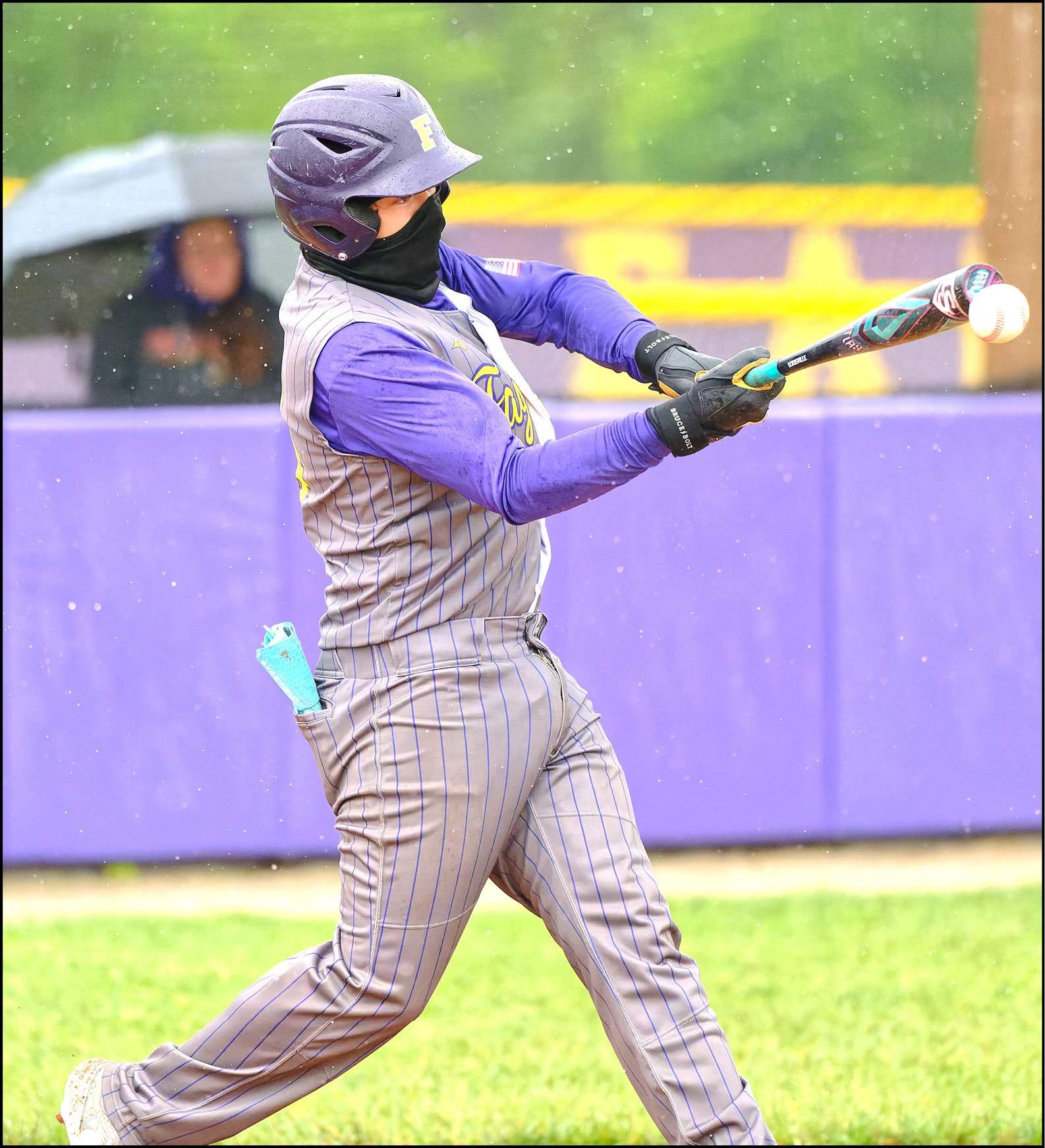 IN THE RAIN … Fayette’s Caleb Lerma takes a cut in Fayette’s sectional semifinal versus Stryker. The game was started on May 20 but suspended due to rain before finally finishing on May 23.