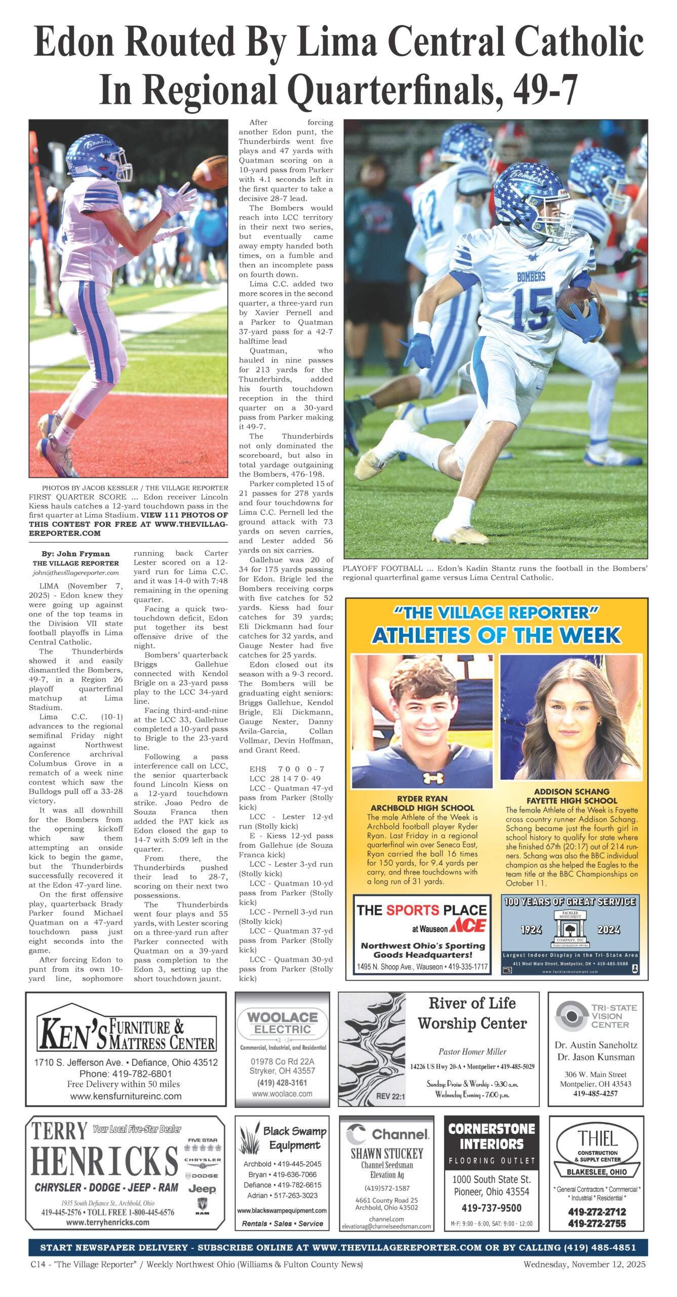 Gallehue was 20 of 34 for 175 yards passing for Edon. Brigle led the Bombers receiving corps with five catches for 52 yards. Kiess had four catches for 39 yards; Eli Dickmann had four catches for 32 yards, and Gauge Nester had five catches for 25 yards.