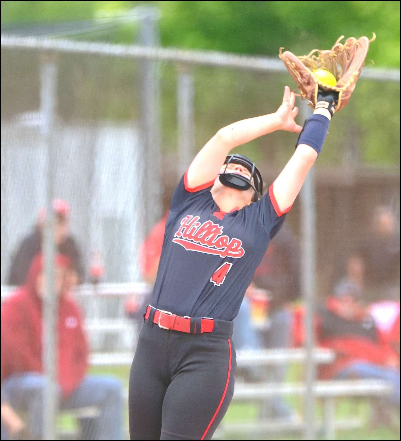 MAKING THE CATCH … Brooklyn Kuszmaul catches a pop up in foul territory beside third base to end the first inning for Hilltop in their Division VII regional semifinal against Mohawk.
