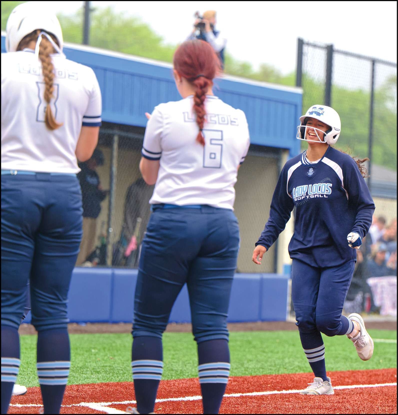 TOUCH’EM ALL … Teammates wait at home plate to greet Madelyn Hopper after her solo home run in the fifth inning.