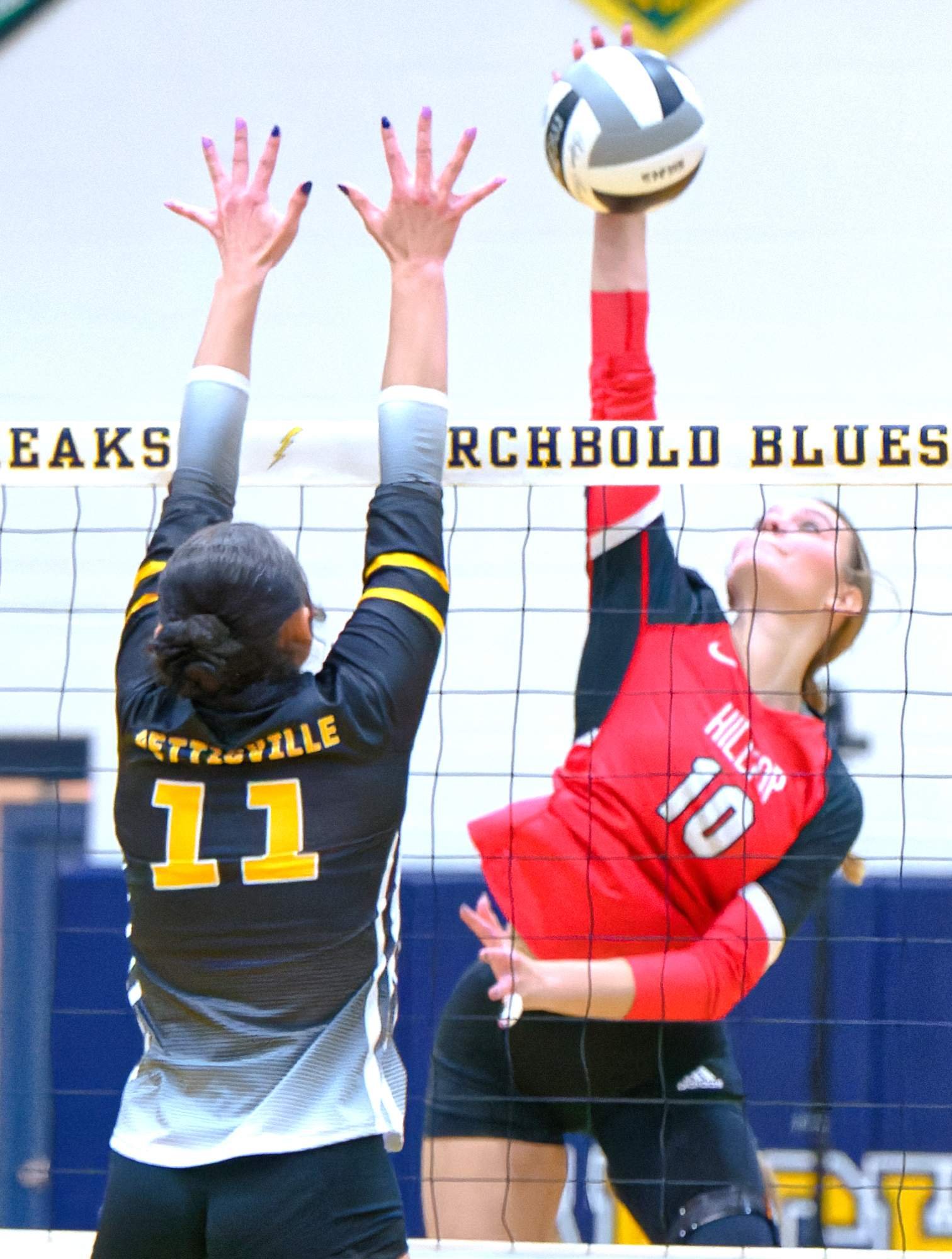 DISTRICT SEMIFINAL … Hilltop’s Brynn Rodriguez drives the ball through the attempted block by Courtney Wiemken (#11).