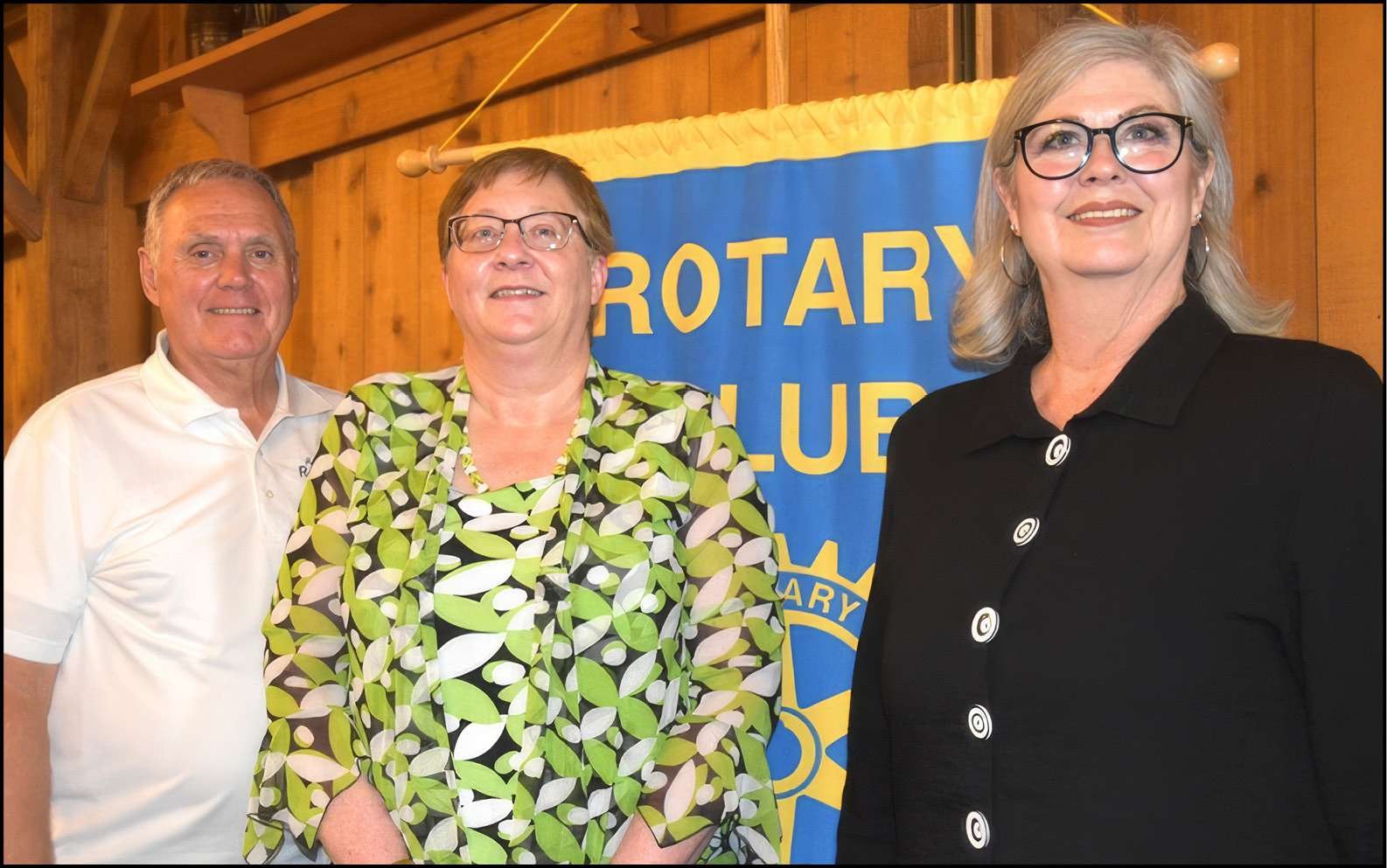 COLLEGE ANNIVERSARY … Defiance College president Richanne Mankey (right) and Barb Seddock, the college’s lead librarian, presented a program on Defiance College’s 175th anniversary to Archbold Rotarians on May 30. Rotarian and Defiance College alum Bob Aschliman is also pictured.
