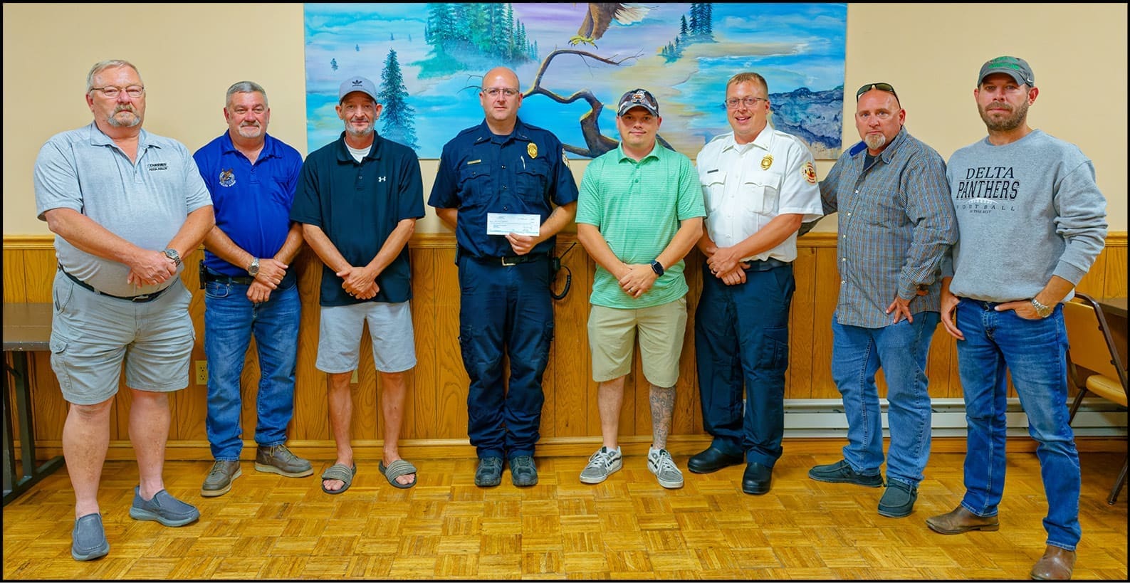 DELTA FIRE … Members of the Delta Fire Department stand with representatives of the Delta Eagles after receiving their donation. Pictured are Doug Born, James Whitehead, Corey Sayen, Lt. Sean Smith, Delta Eagles President Josh Heinemann, Lt. Jon Marvin, Tim Cowden, Ryan Spiess.