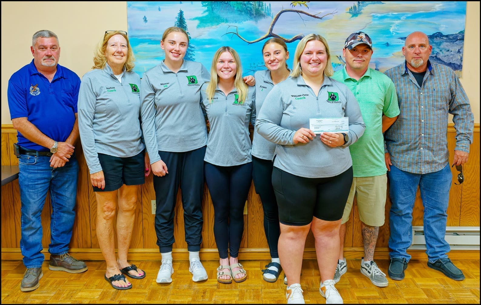 VOLLEYBALL … Members of the Delta High School volleyball team stand with representatives of the Delta Eagles after receiving their donation. Pictured are James Whitehead, Stephanie Rayfield, Mackenzie Mercer, Olivia Burkhart, Natalie Friess, Heather Williams-Jutte, Delta Eagles President Josh Heinemann, Tim Cowden.
