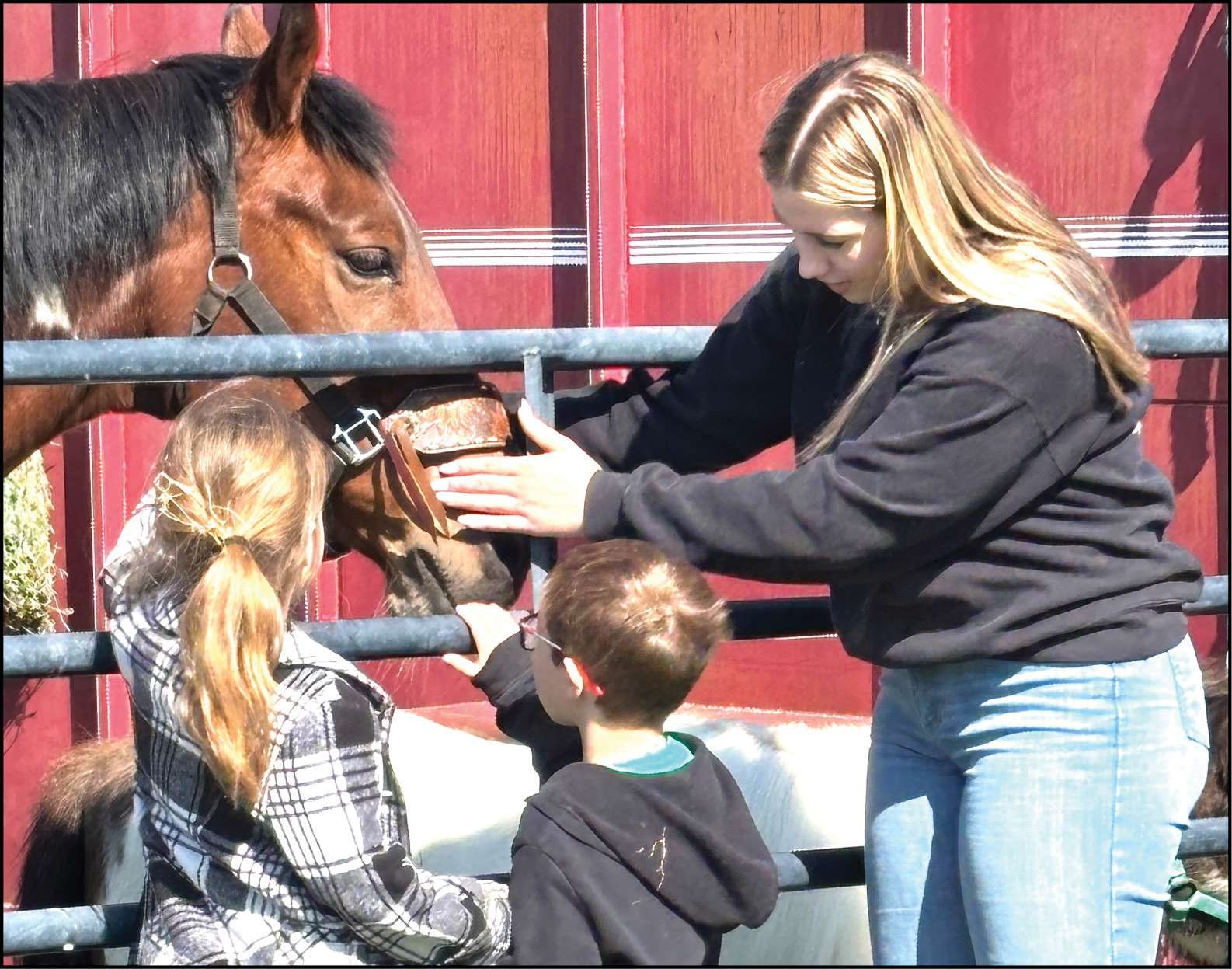 PETTING THE ANIMALS … Junior Kelsi Willitzer lets students safely pet her horse Dream who she trains to show at jackpot shows or barrel racing contests.