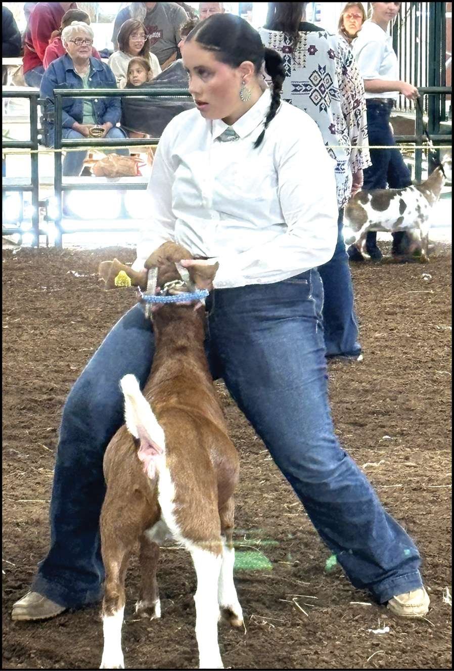 SHOWING ANIMAL … Ashlynn Tedrow braces her goat during the show at the Fulton County Fair.