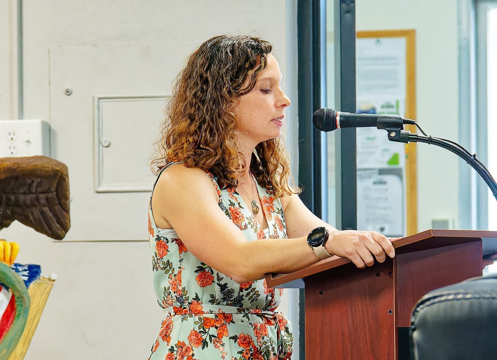 QUESTIONING FIRING … Resident and Chamber of Commerce President Kirsten Fruchey speaks to council in order to get answers regarding the firing of former Village Administrator Andy Glenn.