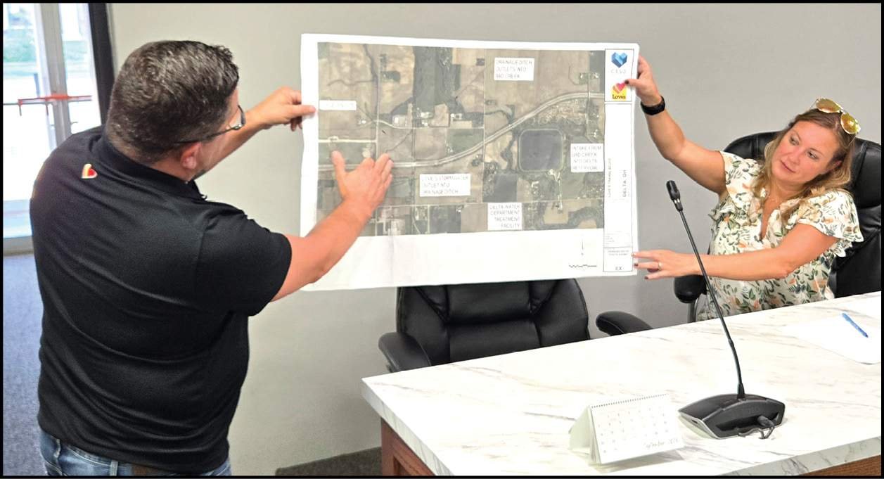 BREAKING IT DOWN … Love’s Travel Stop Real Estate Project Manager Steve Walters (left) explains the proposed layout of the stormwater system for the new Love’s Travel Stop, to be located on the northwest corner of the intersection at County Road H and State Route 109. Also pictured is Councilwoman Daphne Demaline (right).