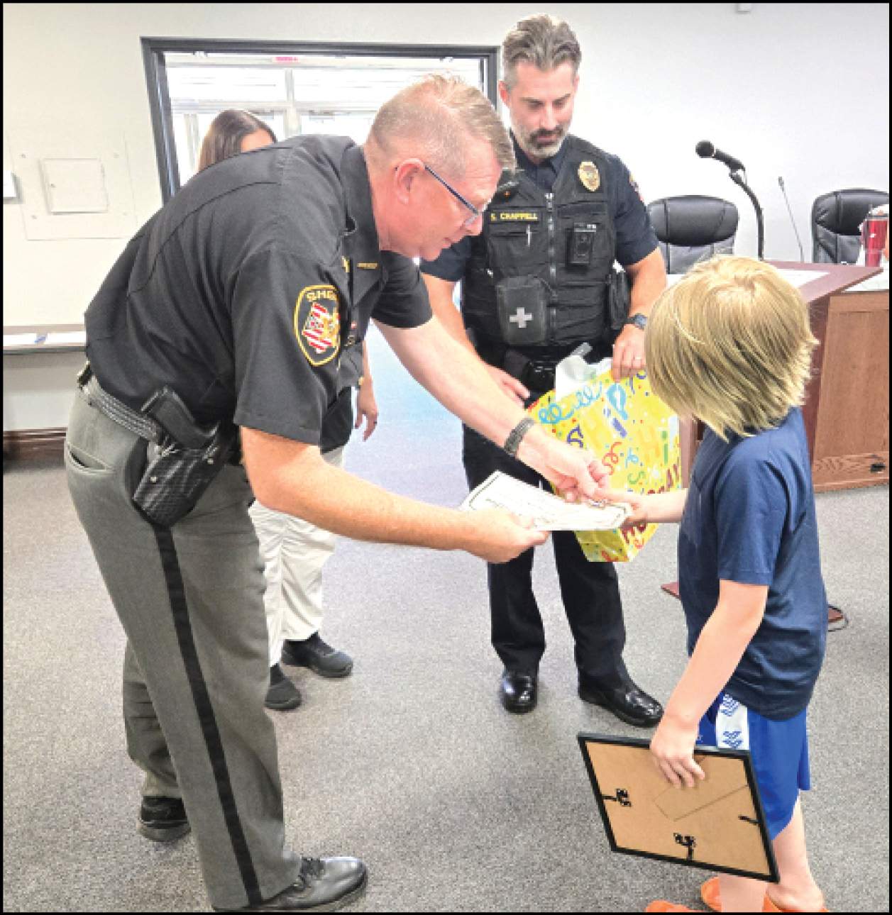 Police Chief Samuel Chappell presented a Lifesaving Award to local resident RJ Greene for calling 911 on July 15, which resulted in lifesaving care being provided to a member of his family.