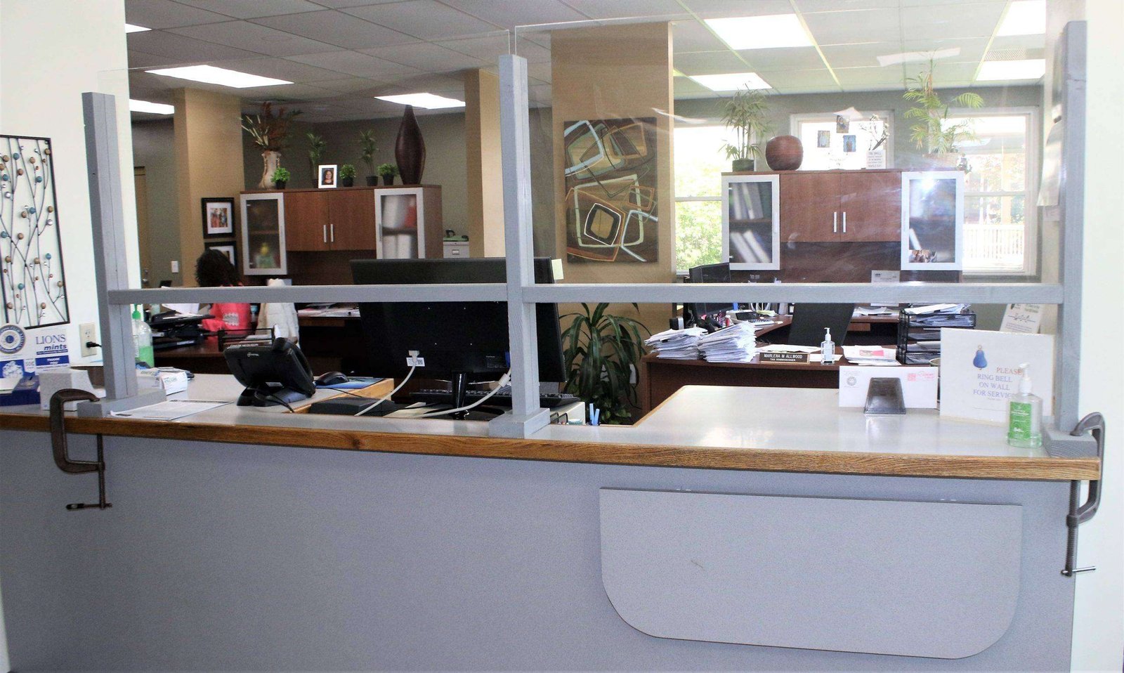 NEW SAFETY MEASURES … A plexiglass barrier sits on top of the Village Services counter.