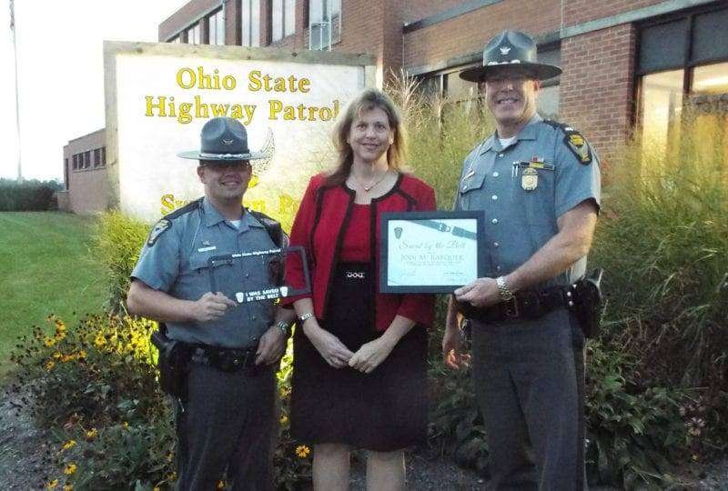 On October 10, Lieutenant Vern E. Fisher, Swanton Post, presented her with a “Saved by the Belt” certificate signed by Ohio Department of Public Safety Director Thomas J. Stickrath and Colonel Richard S. Fambro, Patrol superintendent.