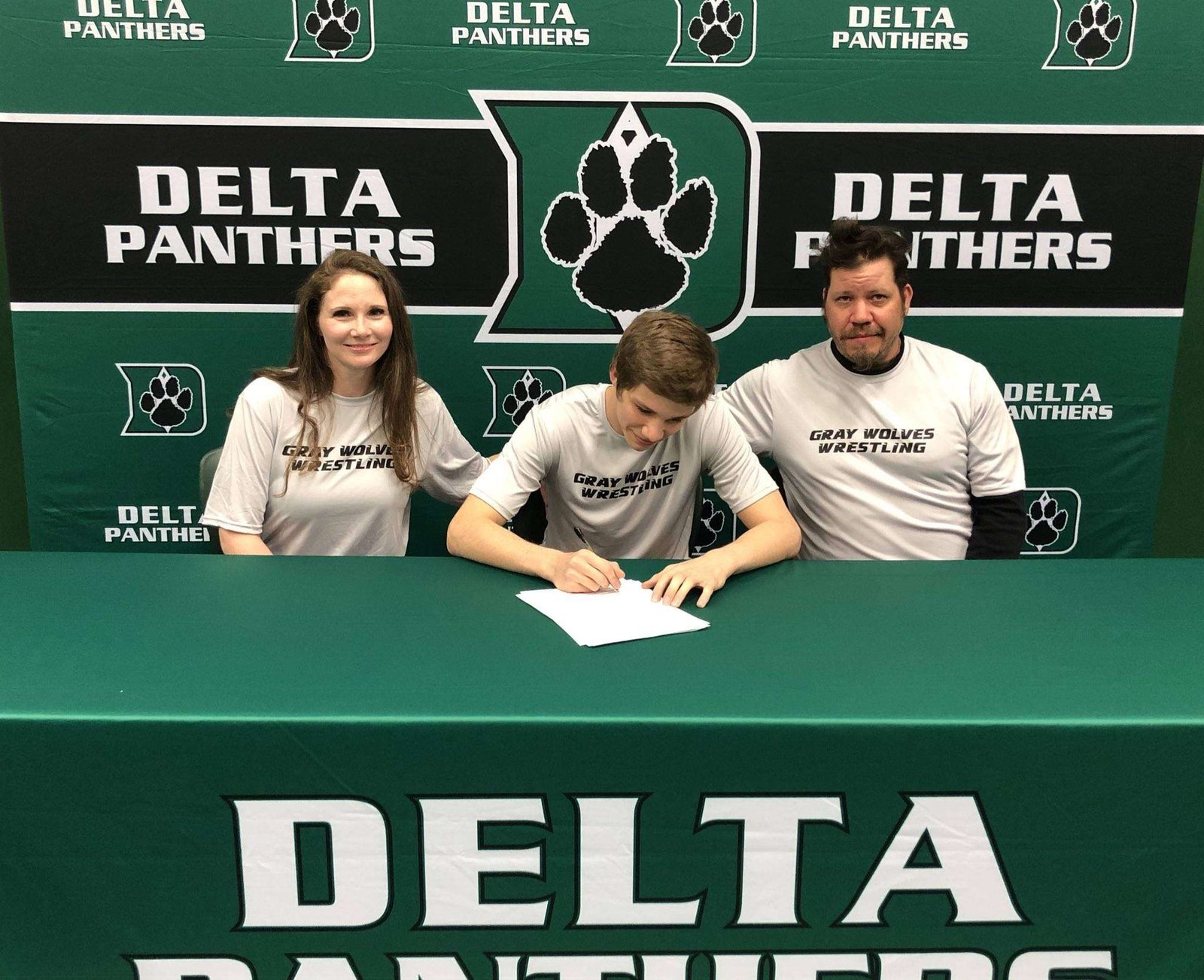 COLLEGE WRESTLING … The Delta wrestling program has sent another wrestler to the college level with Gabe Meyer signing to attend Lourdes University. Meyer went 38-10 at 138 pounds this season and placed fifth at the OHSAA Division III State Championships. Seated with Gabe at his signing event are Tiffanie Meyer (mother) and Casey Meyer (father). (PHOTO COURTESY OF DELTAATHLETIC DEPARTMENT)
