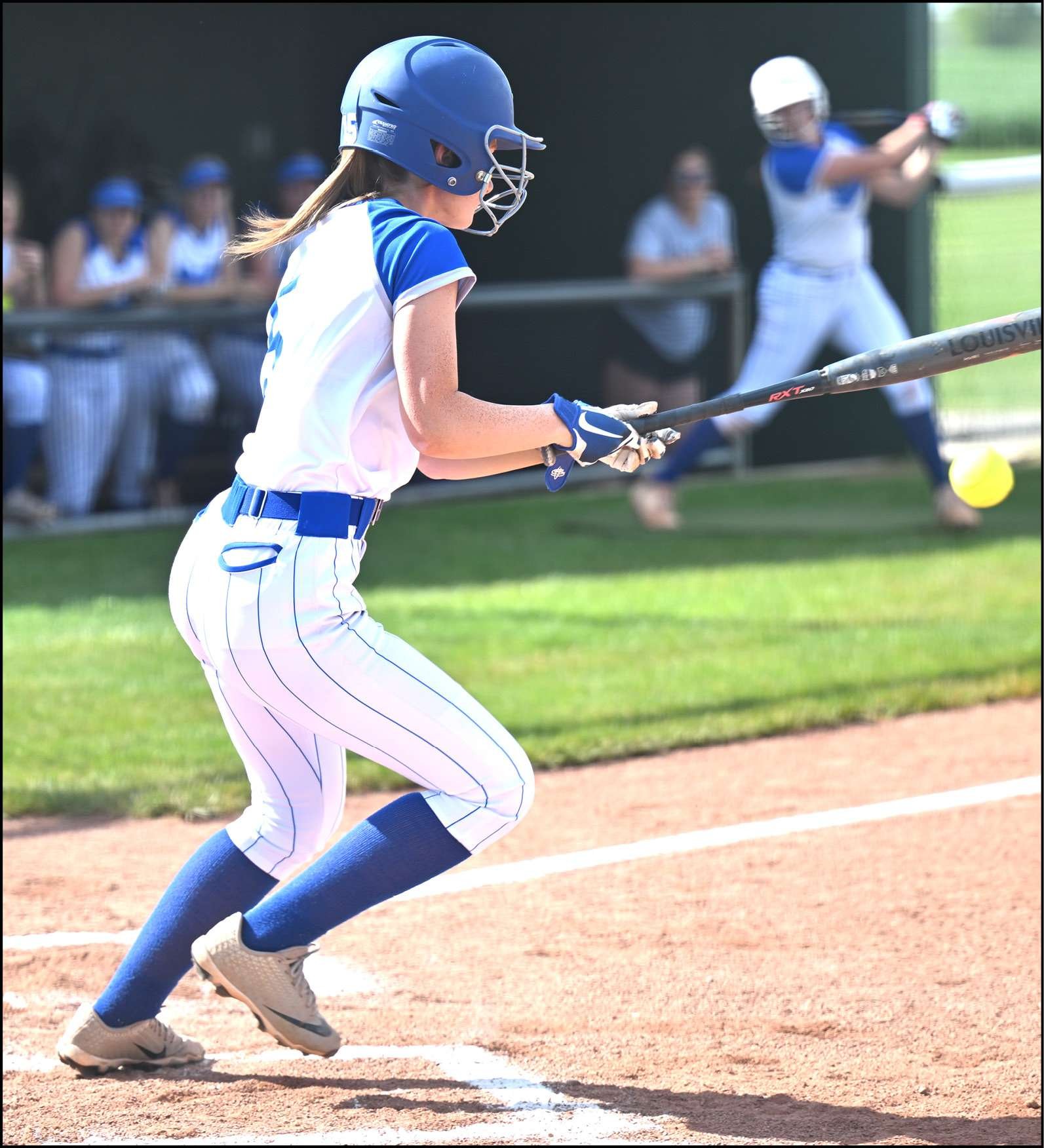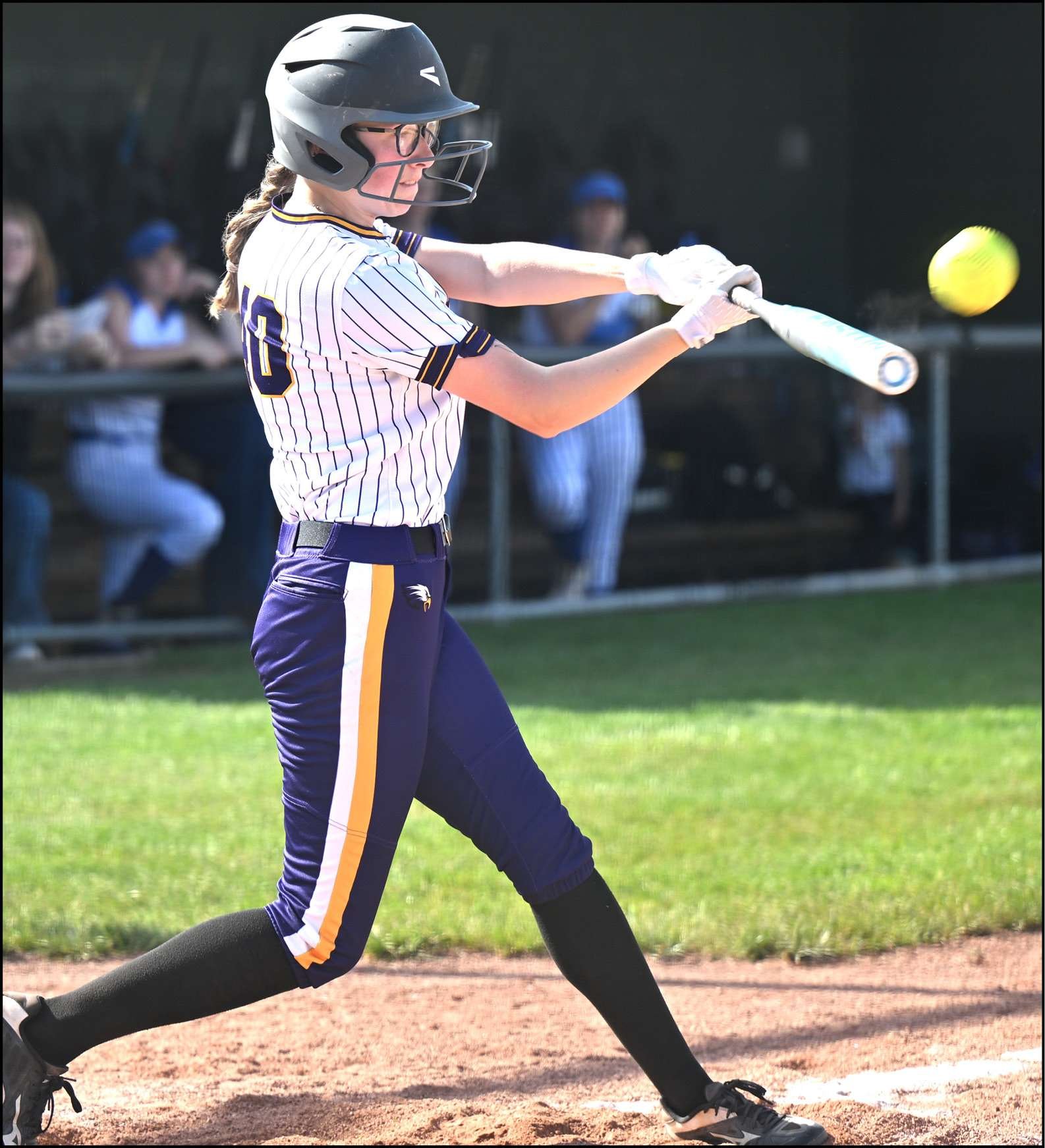 LADY EAGLE … Reilly Bailey takes a cut during sectional final softball at Edon.