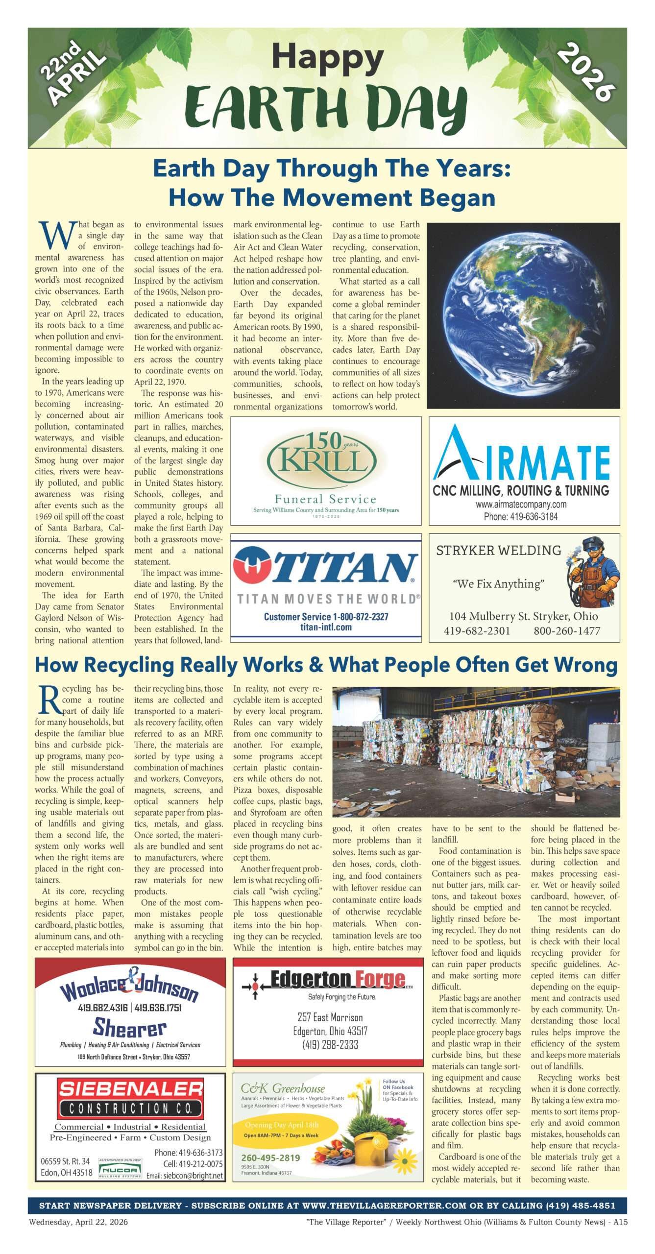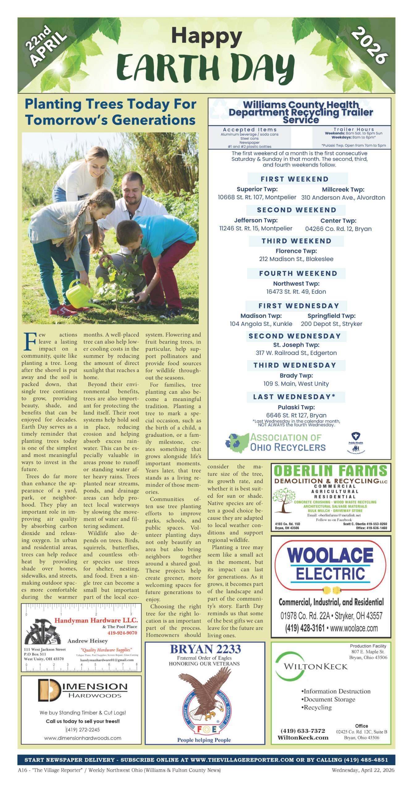 In recognition of Earth Day on April 22, The Village Reporter takes a look at the history and lasting impact of one of the world’s most recognized civic observances. This special two-page feature traces Earth Day’s origins from a 1970 grassroots movement to its role today as a global reminder of shared environmental responsibility, explores the common mistakes households make when recycling and how to avoid them, and highlights why planting a single tree can be one of the most meaningful gifts left for future generations. Readers will also find the Williams County Health Department’s recycling trailer service schedule, listing drop-off locations and dates for townships across the county.