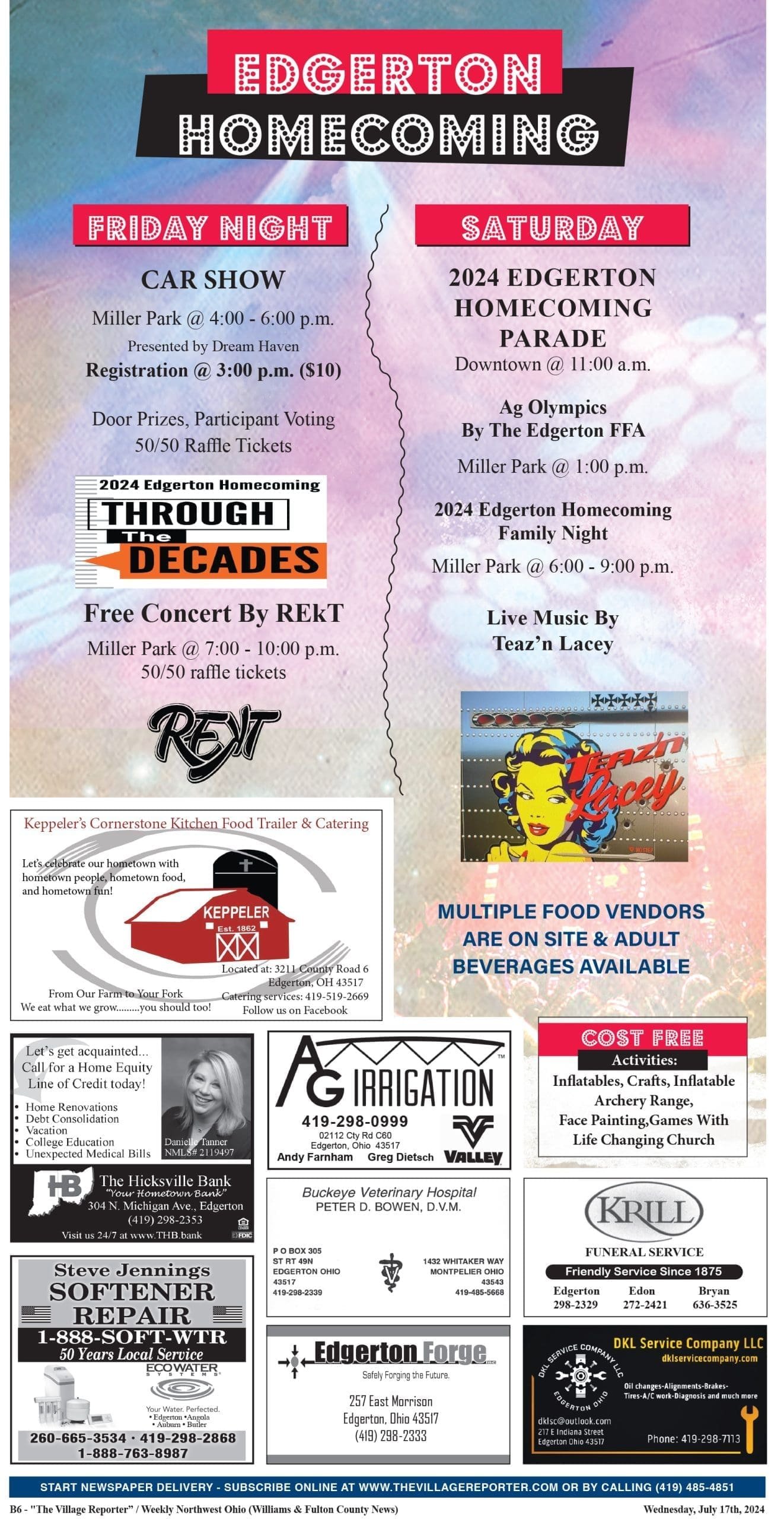 The celebration will continue on Saturday with the 2024 Edgerton Homecoming Parade in downtown Edgerton at 11:00 a.m. The parade will be followed by the Ag Olympics at Miller Park at 1:00 p.m., hosted by the Edgerton FFA.