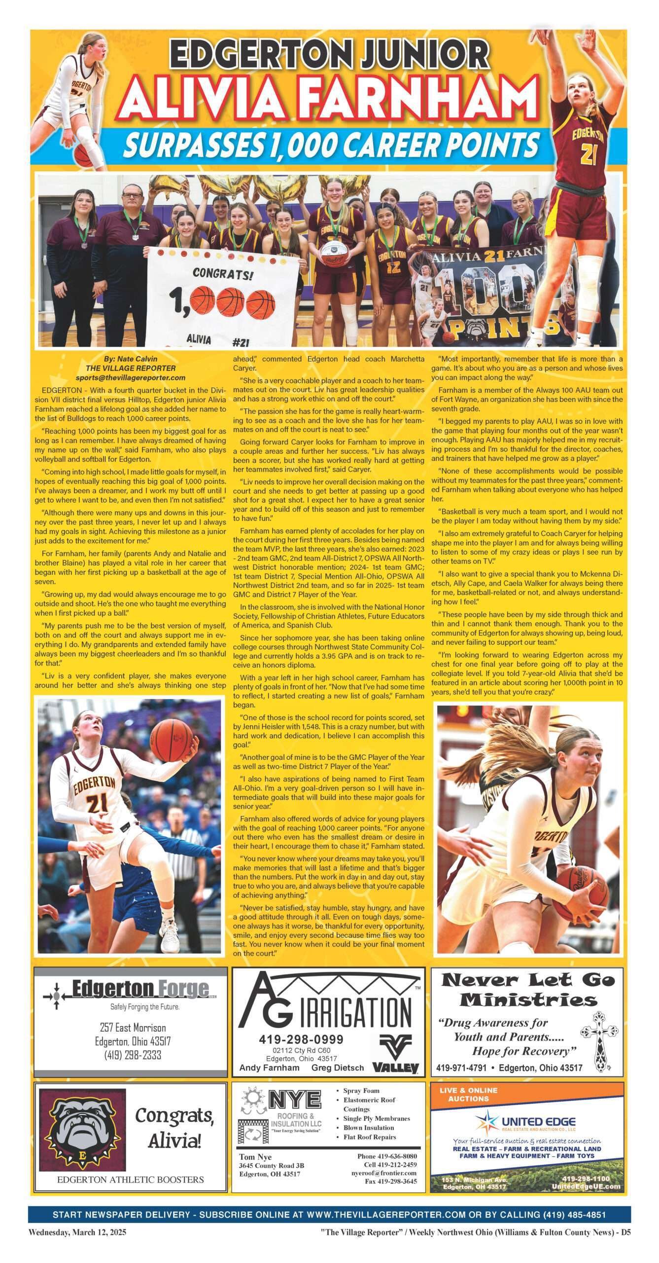 EDGERTON – With a fourth quarter bucket in the Division VII district final versus Hilltop, Edgerton junior Alivia Farnham reached a lifelong goal as she added her name to the list of Bulldogs to reach 1,000 career points.
