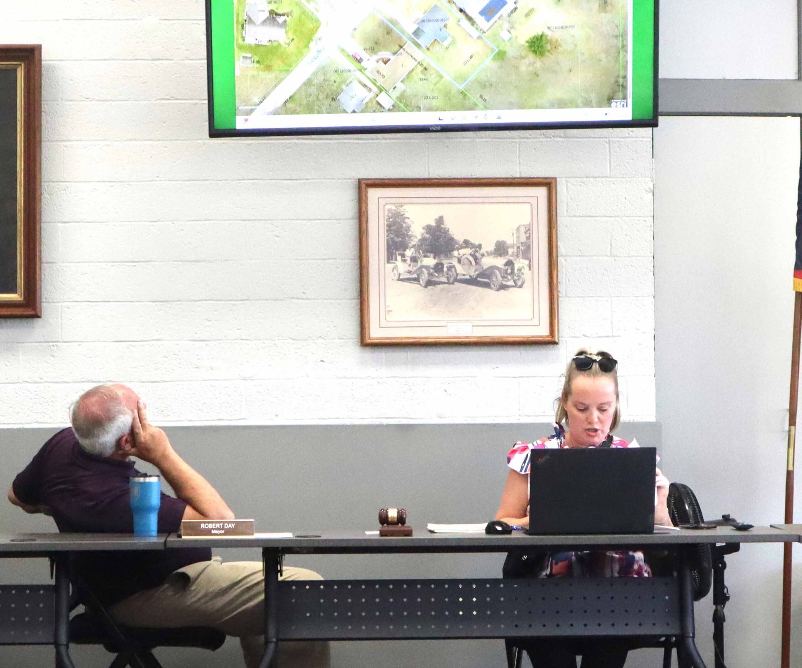 VARIANCE UPDATE … Village Administrator Dawn Fitzcharles (right) displays a map of the parcel for which a garage variance is requested, as Mayor Bob Day (left) observes.