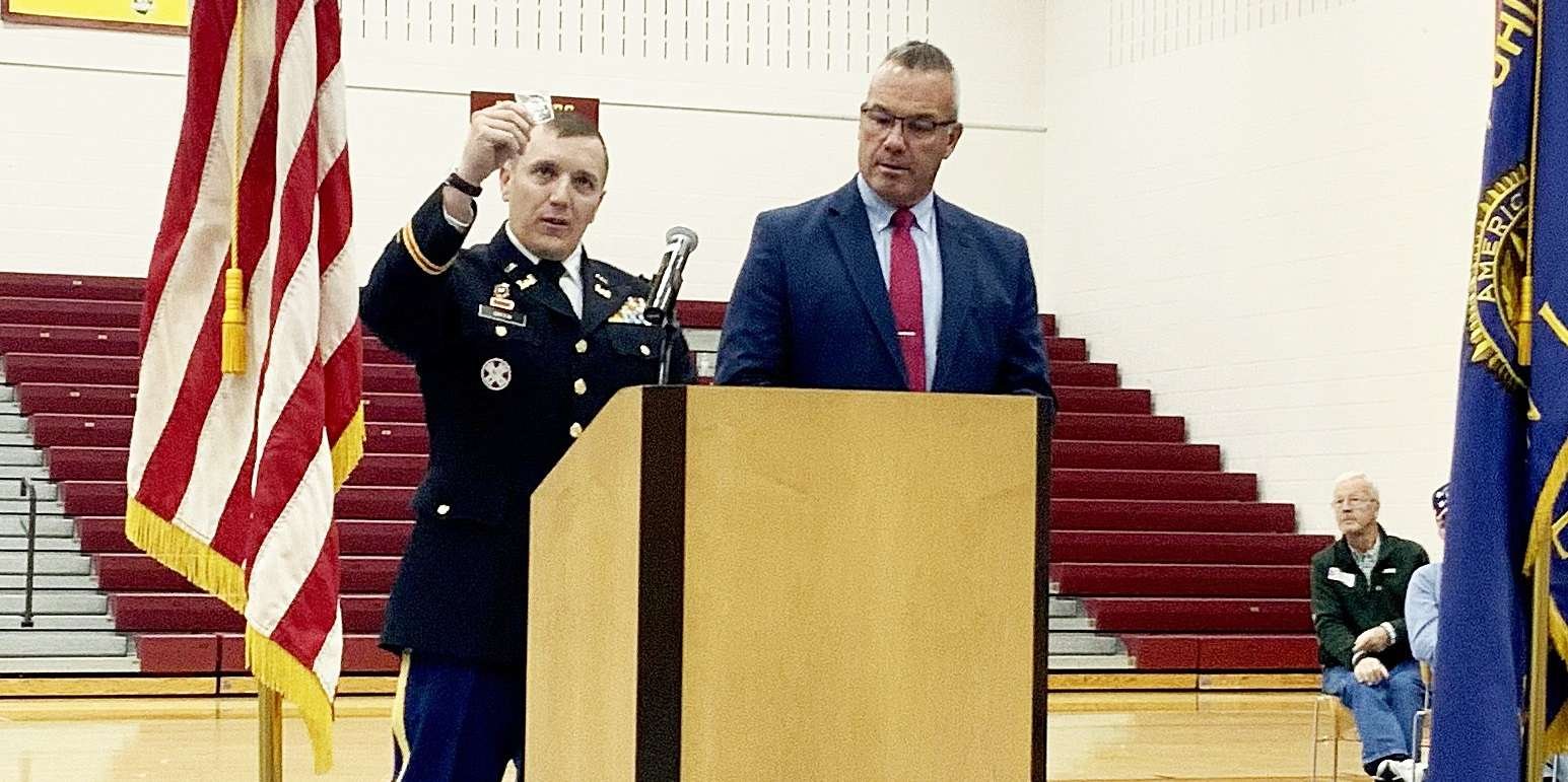 HONORED GUEST … Lieutenant, Brett Green, Commander of the 837th Brigade Engineer Battalion Superintendent of NOVA Initiatives, was the chosen as the Honored Guest for a speech at Edgerton’s Veterans Day Celebration. After his speech, Green gave Superintendent, Riehle a Challenge Coin for the community. (PHOTOS BY LINDSAY PHILLIPS, STAFF)