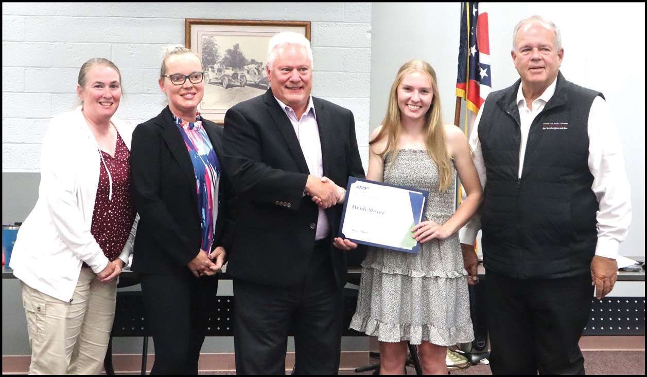 SCHOLARSHIP AWARD … AMP representative Harry Phillips presents Edgerton graduate Heidi Meyer with the Lyle B. Wright scholarship. From left Kimberly Meyer, Village Administrator Dawn Fitzcharles, Harry Phillips, Heidi Meyer, and Mayor Bob Day.